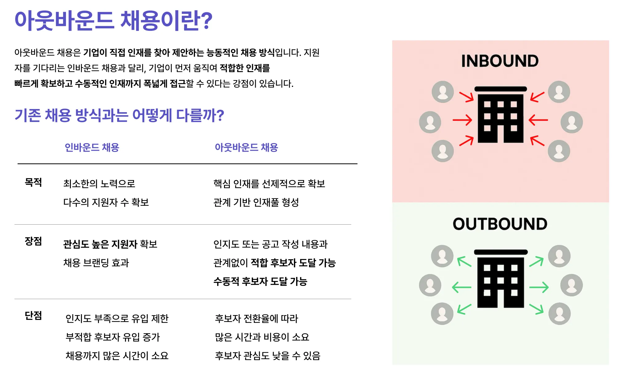 공고를 올려놓고 지원을 기다리는 방식이 아니라, 이직 가능성이 있는 후보자에게 기업이 먼저 다가갈 수 있도록 돕는 아웃바운드 채용 방식이죠.