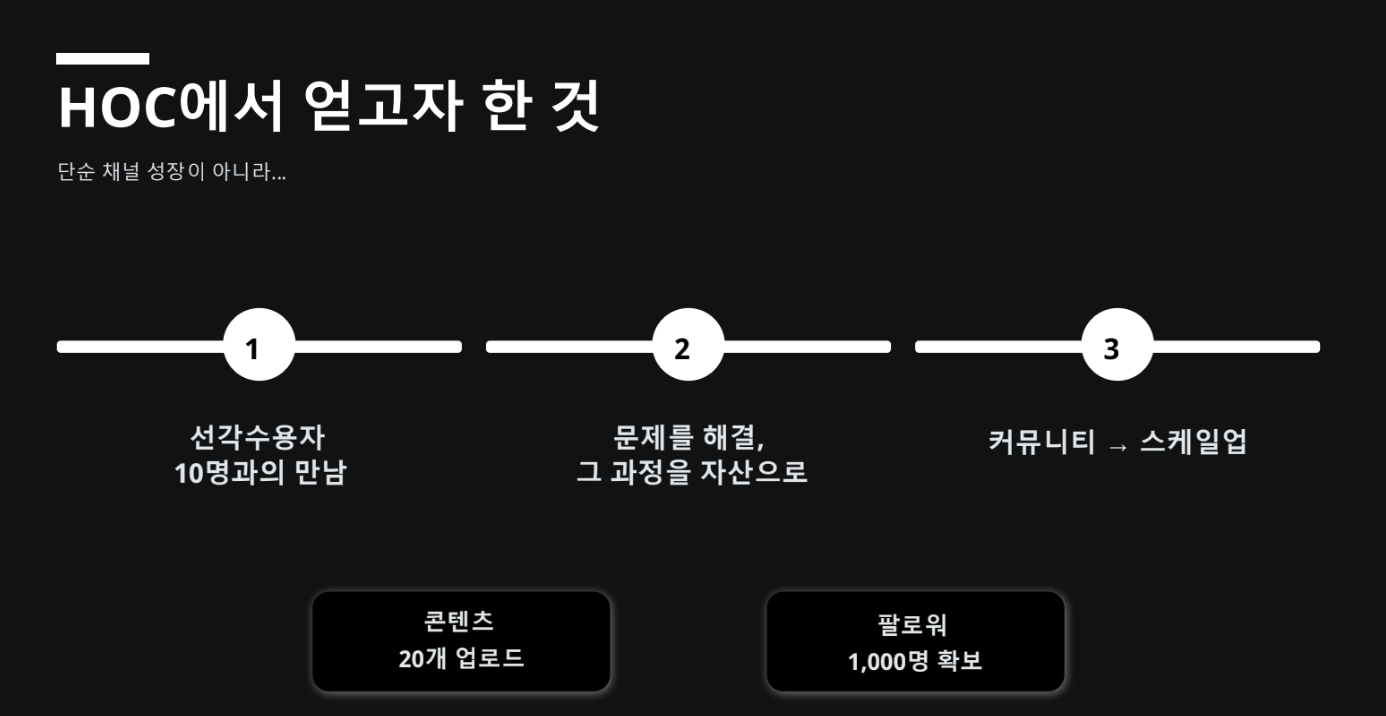 - 둘째, 빠른 수요 검증을 통해 MVP 설계에 들어가기. 프롬프트 챌린지로 첫 프로그램을 만들었고, 플랫폼 협업까지 이어졌어요.