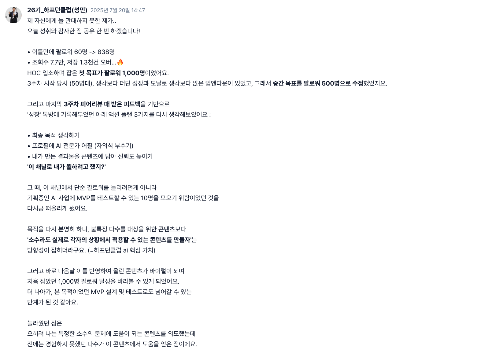 더 많은 사람을 끌어모으는 게 목표가 아니라, 내 콘텐츠로 실제 도움이 되는 사람에게 제대로 닿는 게 목적이었는데, 그걸 잊고 있었던 거예요.