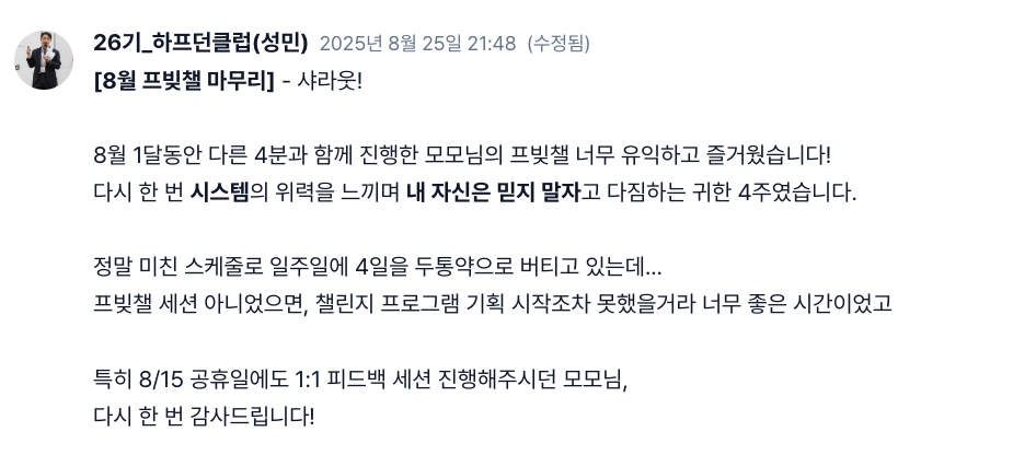 결과에 흔들려서 방향을 잃기 쉬운 사람, 혼자서는 시작이 어려운 사람, 실행은 하고 싶은데 구조가 없는 사람에게 하이아웃풋클럽이 잘 맞는다고 생각해요.