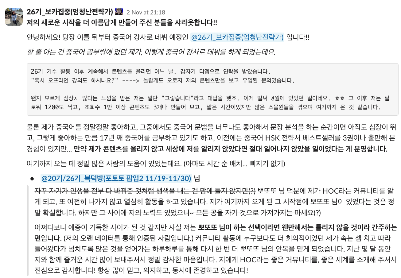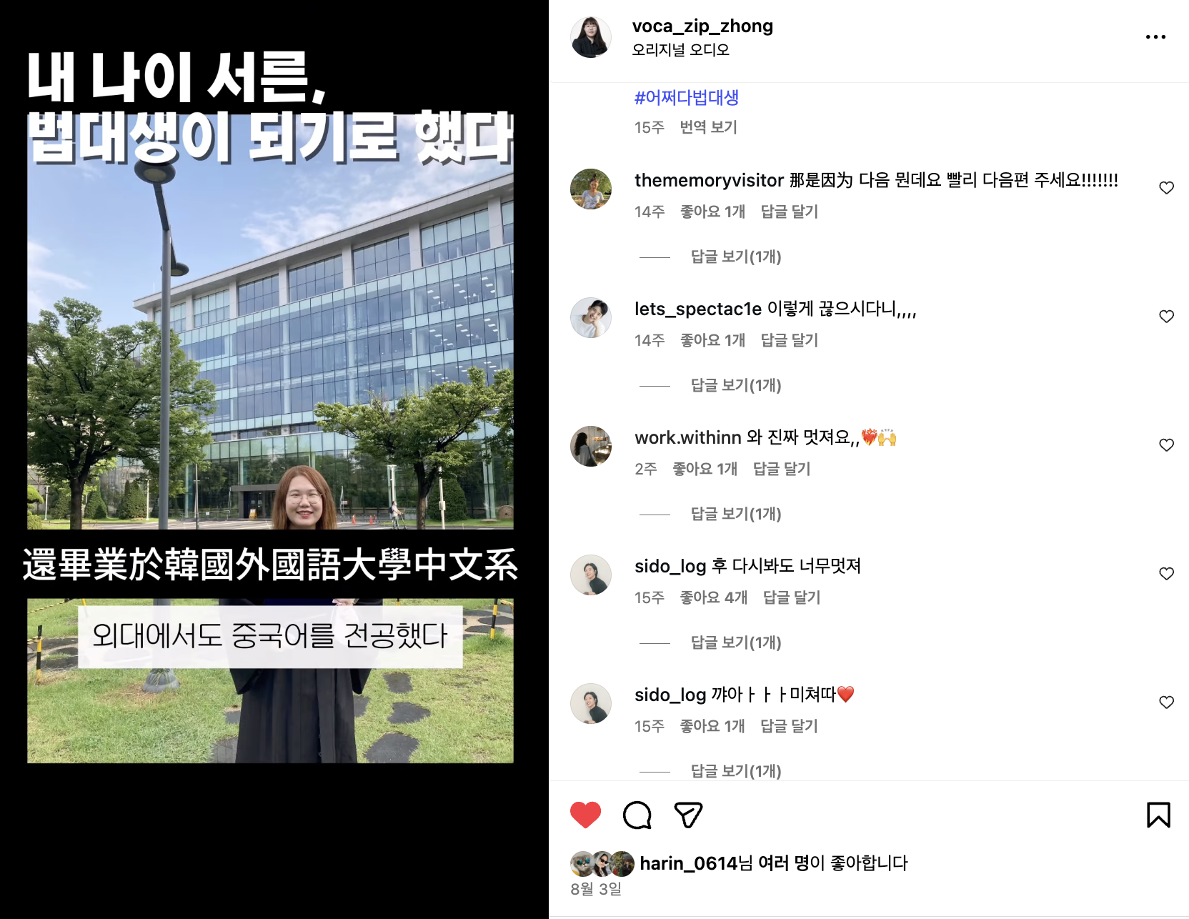 이러한 것들을 계속 보카집중 계정에 아카이빙하면서 사람들과 도전, 실패, 그리고 중국어, 법률에 대한 다양한 이야기를 통해 소통하고 싶어요.