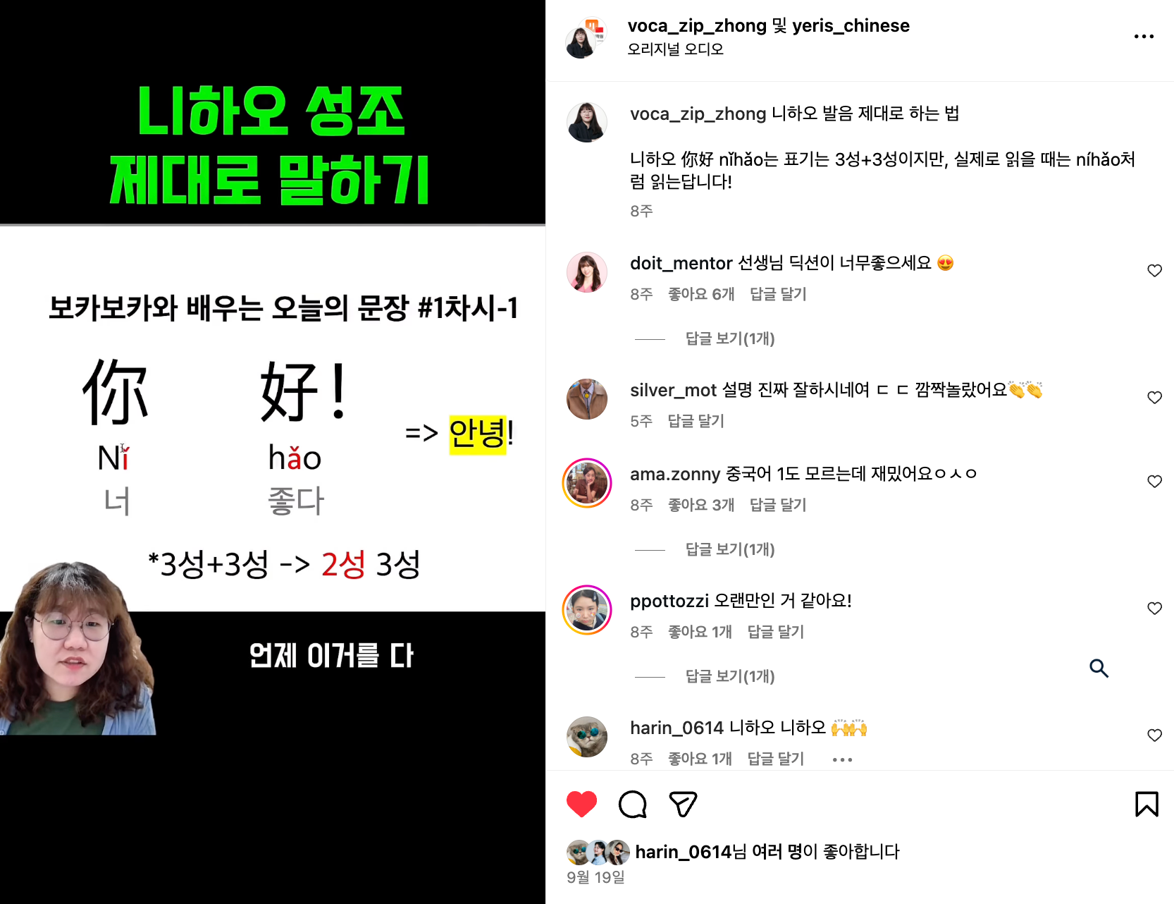 정말 예상치도 못하게 터졌던 '니하오 성조 제대로 말하기'라는 릴스인데요.