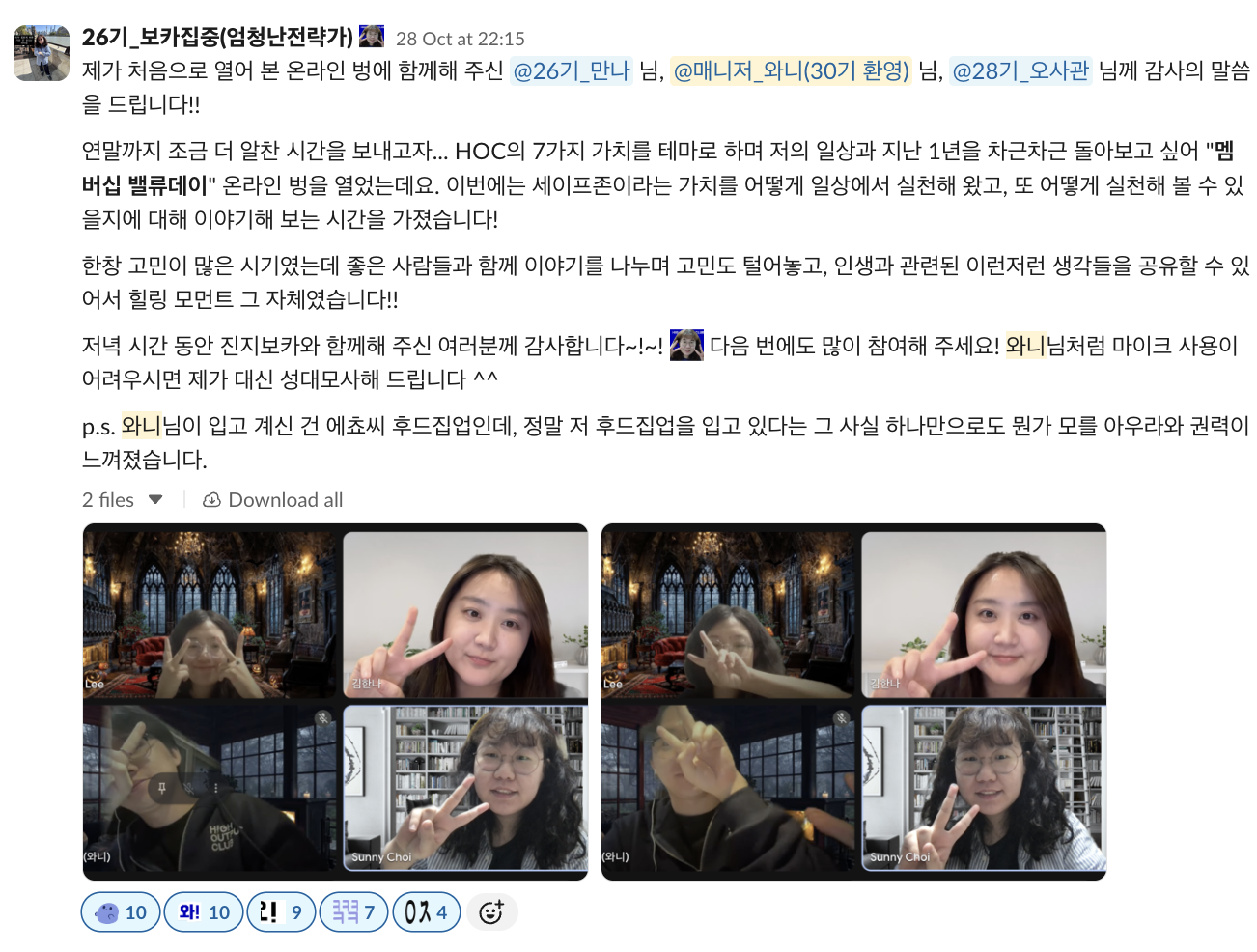 그리고 이렇게 멤버들이 자주 융화되며 함께 어울릴 수 있도록 다양한 세션, 활동을 기획하고 준비해 주시는 게 하이아웃풋클럽만의 특별함이라고 생각해요.