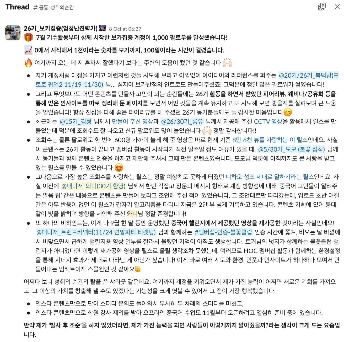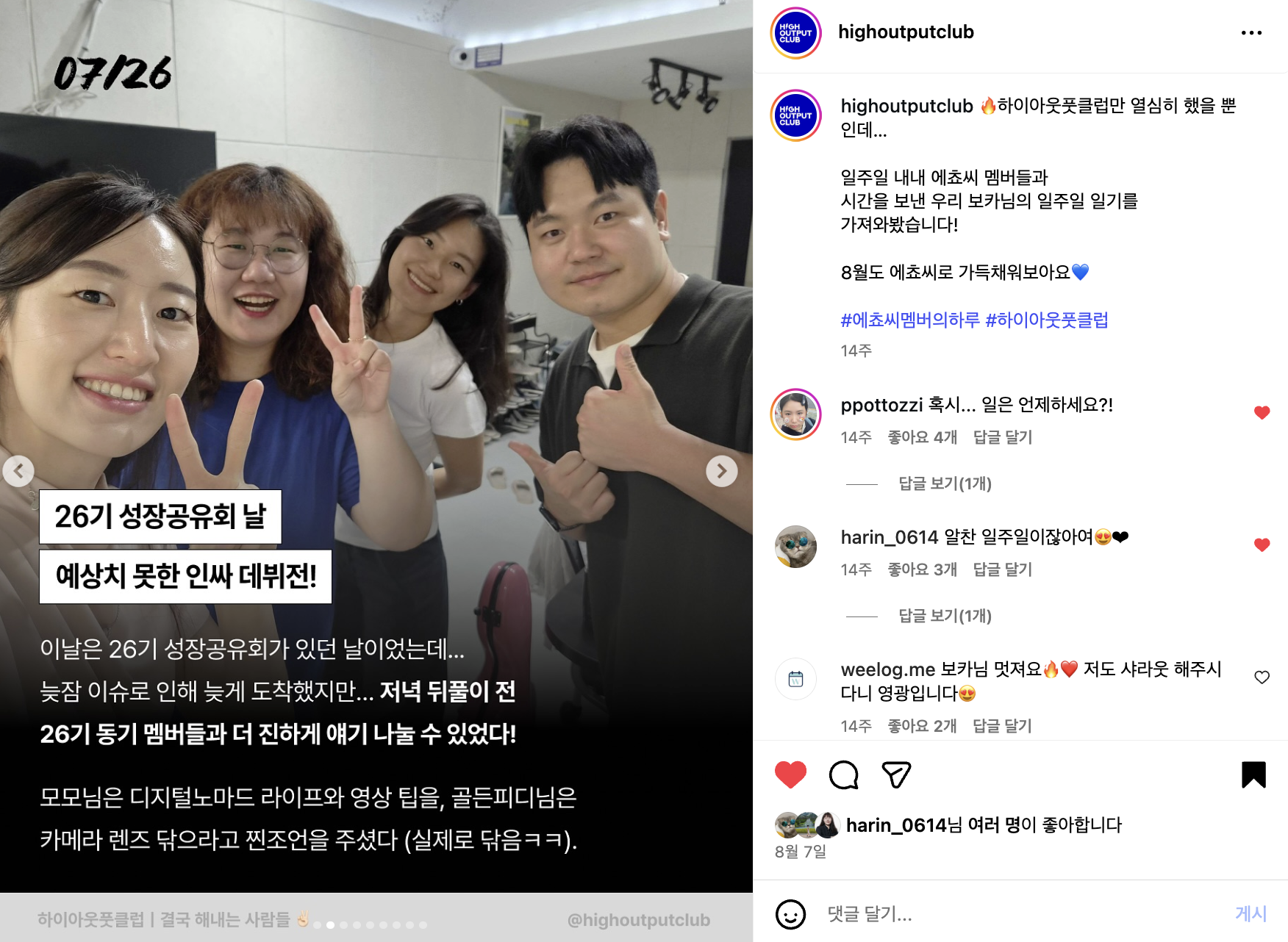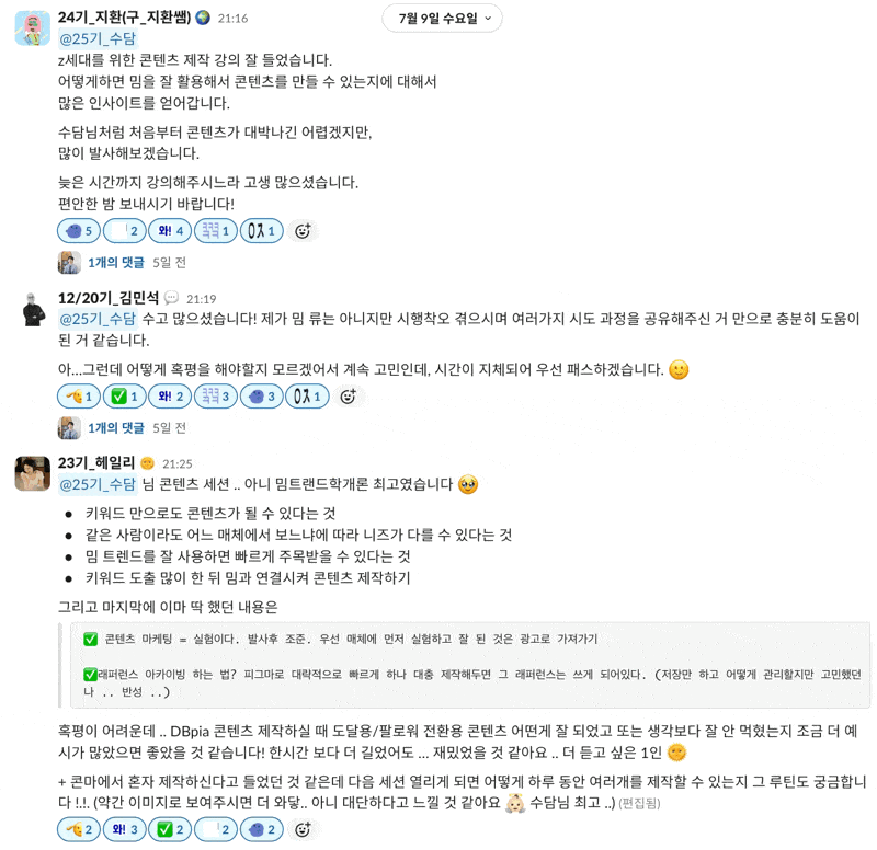 특히 빠르게 성장하는 동기분들의 계정과 콘텐츠를 살펴보면서 같이 기쁘기도 했고, 피어리뷰를 통해 왜 그 콘텐츠가 터졌는지를 분석하면서 콘텐츠를 보는 시야가 훨씬 넓어졌어요.