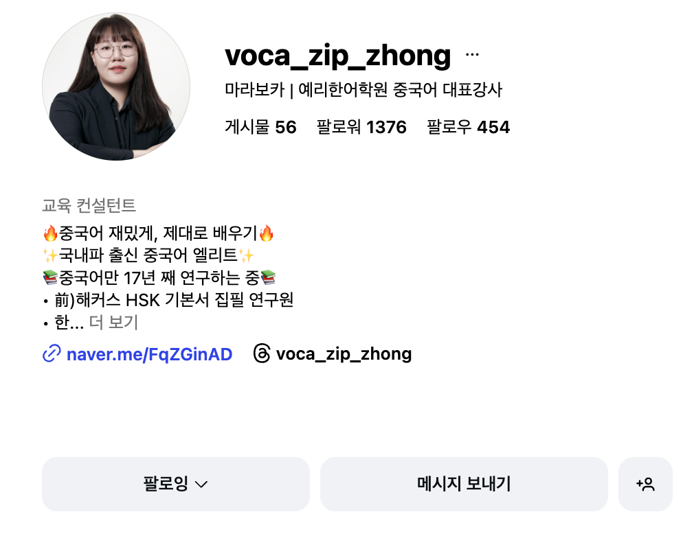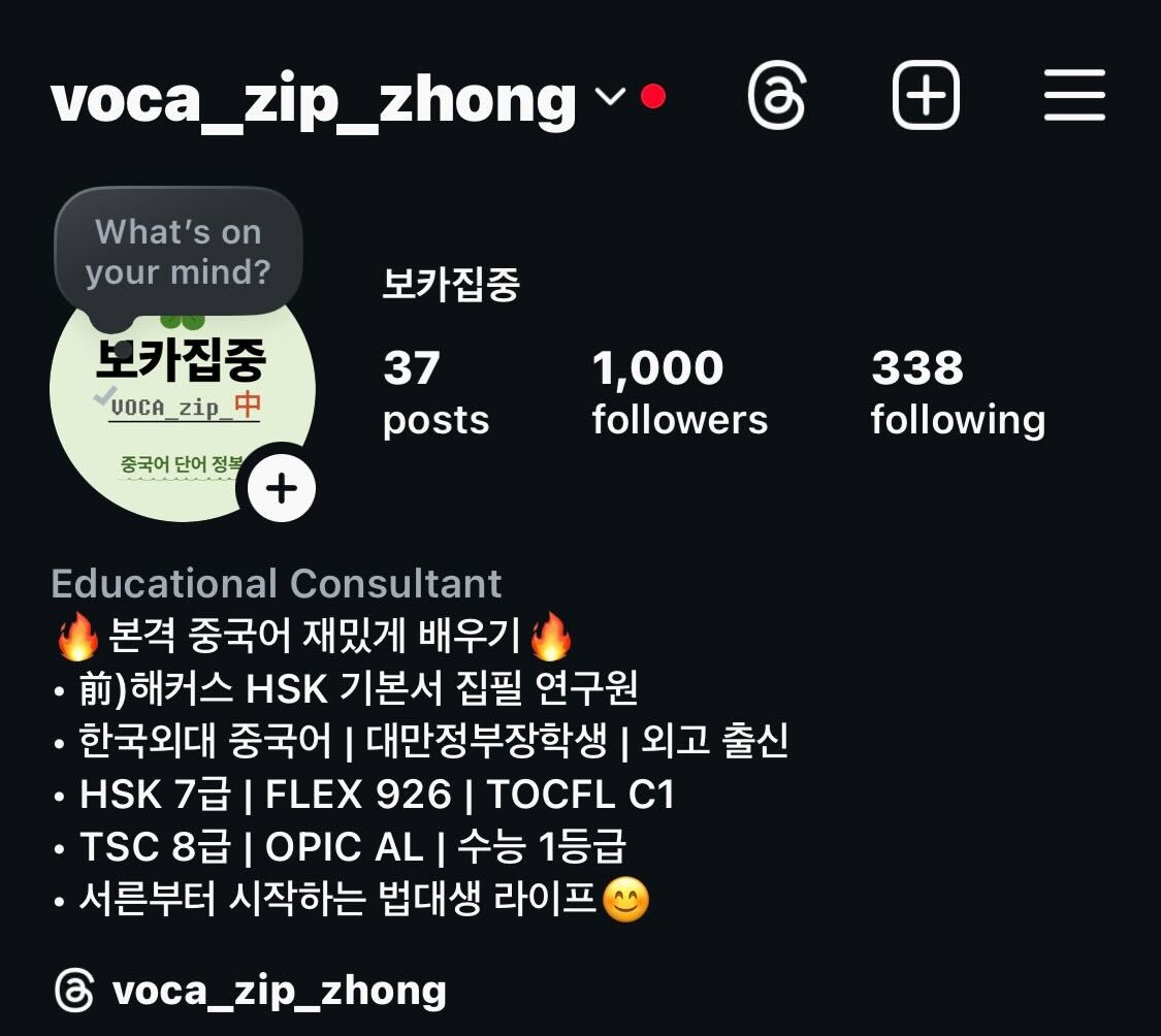 특히 자격증 시험, 그리고 중국어 어휘와 문법을 쉽고 재미있게 익히는 것에 자신이 있었어요. 17년 동안 중국어를 공부하면서 가장 중요하게 생각했던 게 바로 어휘 암기였기 때문에, 어휘 공부에 집중한다는 '보카집중'이라는 계정을 만들게 되었죠.