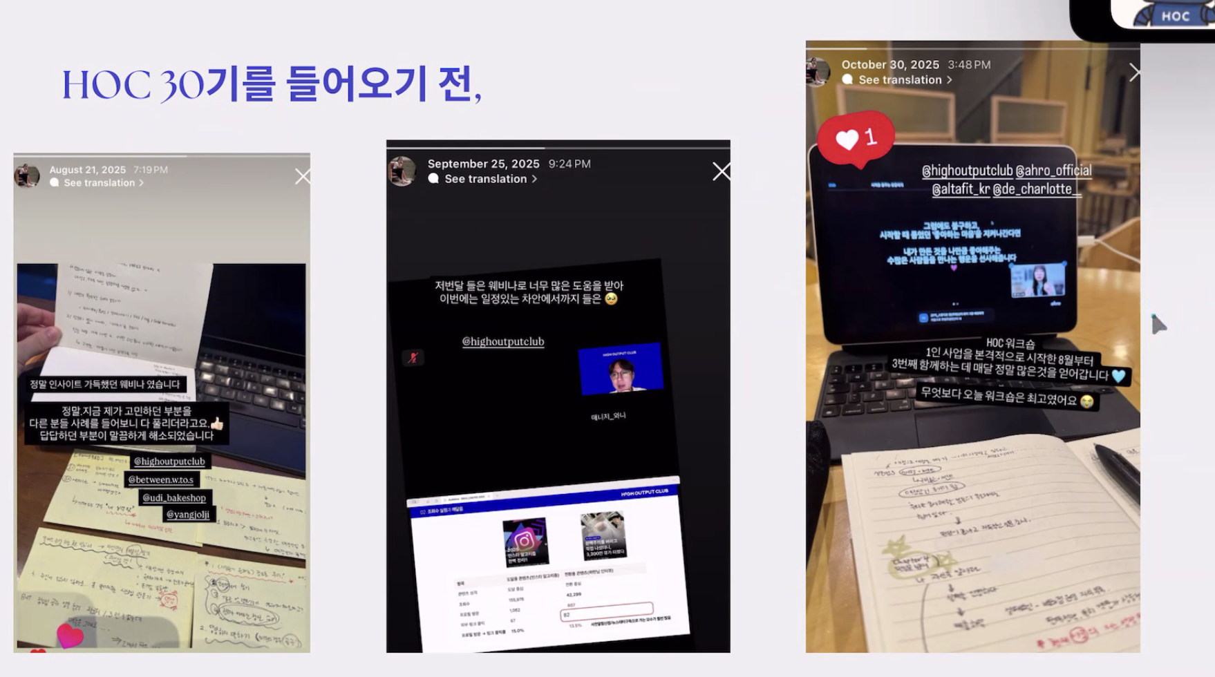 하이아웃풋클럽 30기부터 33기까지 네 기수 연속으로 함께하며, 3년간 멈춰 있던 계정을 3개월 만에 1만 팔로워로 끌어올렸습니다.