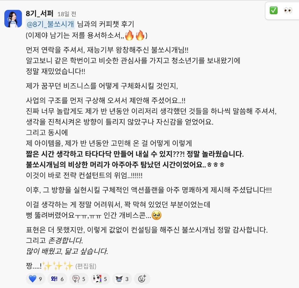 하이아웃풋클럽을 통해 비로소 한 겹 알을 깨고 나올 수 있지 않았을까 생각이 들어요. 8기 불쏘시개님이 먼저 커피챗을 제안해 주셔서 만났던 적이 있는데, 제가 요청하지 않았음에도 불구하고 제 비즈니스에 대해 고민해 주시고, 본인의 전문성을 활용해 이렇게 해 보면 어떠냐고 여러 방향을 컨설팅을 해주시는데 이때 이런 관계가 정말 가능한 거구나 싶었어요. 덕분에 행복하게 안전히 성장할 수 있었답니다.