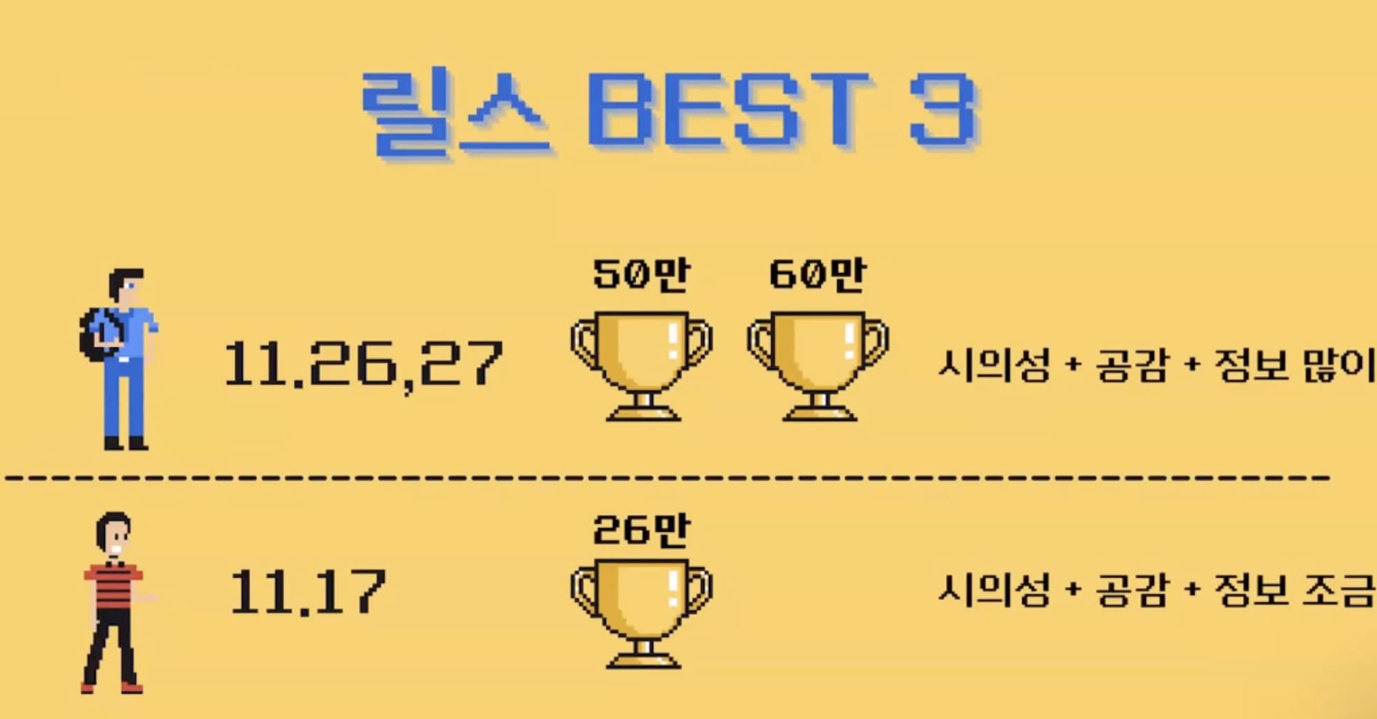 처음 27만 릴스가 터졌을 때, 도대체 어떤 요소 때문인지 분석해 봤어요. 시의성이 있는 주제와 저장할 만한 정보, 그 정보를 나의 관점에서 재해석해서 선보이기, 그리고 어떤 부분이 공감을 불러일으키는 것 이렇게 총 4가지 요소가 보였어요.