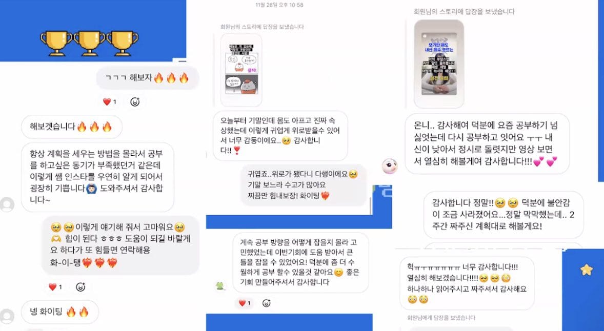 2023년 연말 선물로 겨울 방학 계획 짜는 툴을 무료로 배포하는 이벤트를 진행했는데요. 학생들의 페인포인트를 확인하고자 DM으로 힘든 점 하나씩 적어달라는 조건을 달아보았어요. 350명 정도의 학생들이 고민을 장문으로 남겨주어서 3일간 찐으로 소통을 해보았는데 저에게 있어 직접 한 명 한 명 이야기한 게 너무나 소중하고 값진 성취였던 것 같아요. 멤버분들이 진심으로 축하해줘서 더더욱 행복했답니다.
