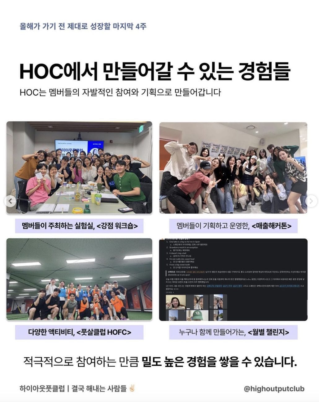 서로에 대한 애정으로 서로를 의지하며 내 일처럼 같이 고민해주고 응원하는 하이아웃풋클럽 커뮤니티가 정말 소중한 것 같아요. 누군가 성장하고 싶다면 HOC 세이프존에서 함께하는 것이 가장 크게 성장하는 방법이라고 자신있게 말할 수 있어요.