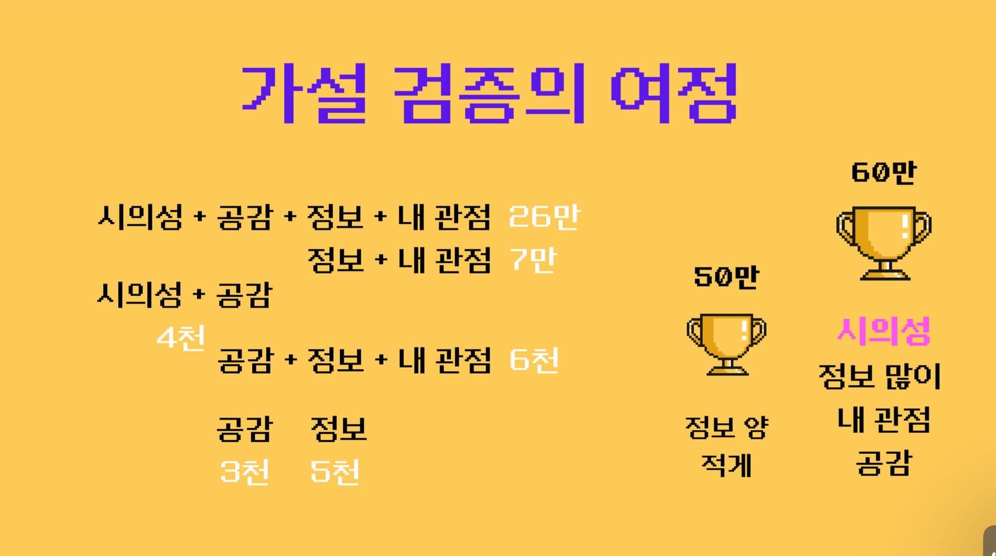 이 4가지 요소를 떡상하는 요인으로 가설을 설정해 어떤 조합이 가장 파워풀할 지 검증해 봤어요. 시의성+공감만 있는 경우, 정보+내 관점만 있는 경우 등 4가지 요소의 서로 다른 조합으로 케이스 스터디를 본격적으로 시작해 봤어요.
