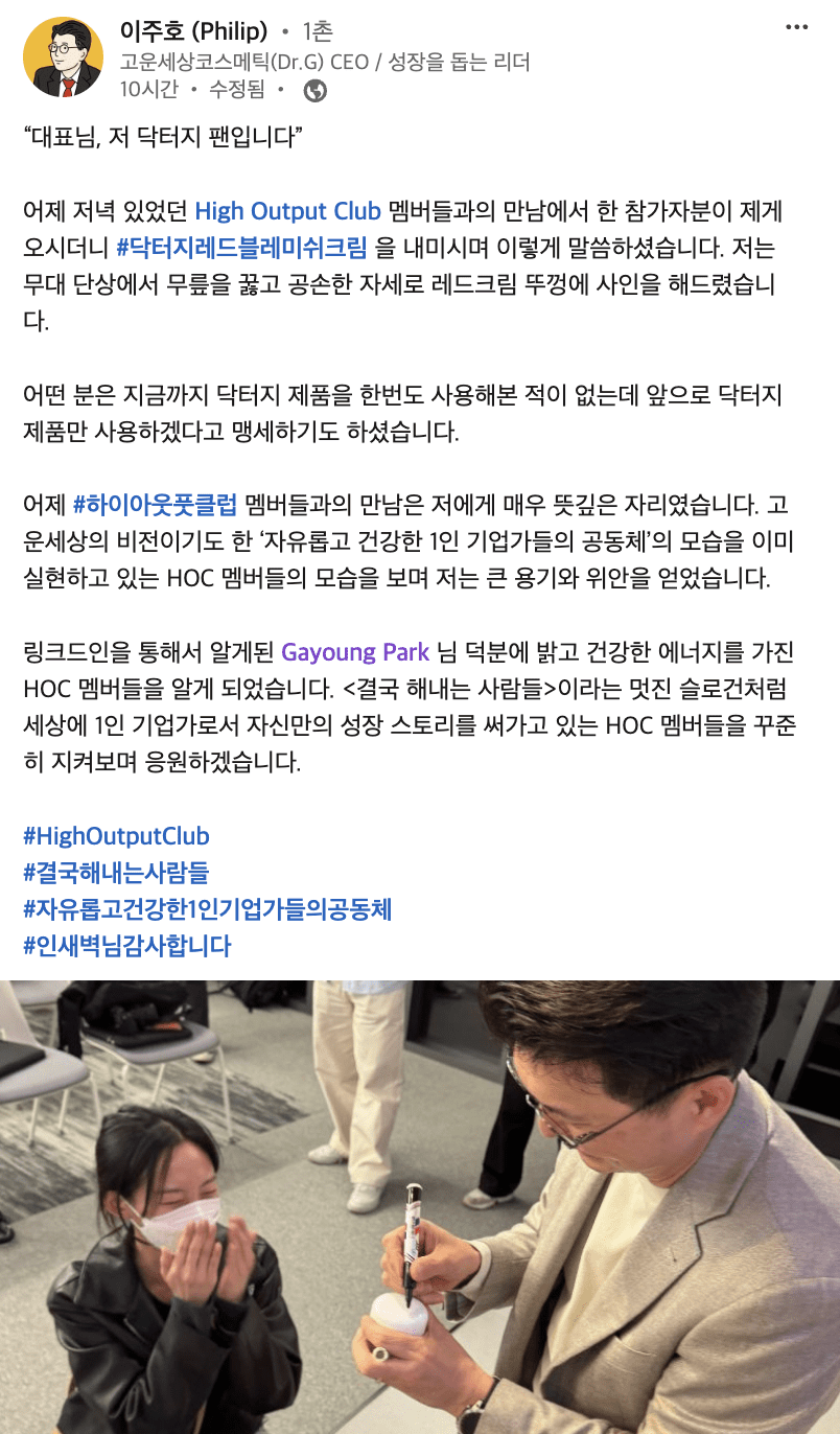 33분기 연속 성장이라는 놀라운 성과와 더불어, 한국에서 가장 존경받는 CEO를 3년 연속 수상하고, 대한민국 부모가 가장 일하기 좋은 기업으로 선정된 고운세상코스메틱과 이주호 대표님의 리더십, 제품 철학, 브랜드, 커리어, 인생에 대해 하이아웃풋클럽 멤버들과 함께 이야기 나눌 수 있는 귀한 자리를 마련했습니다. 그날 있었던 인사이트를 공유드립니다.