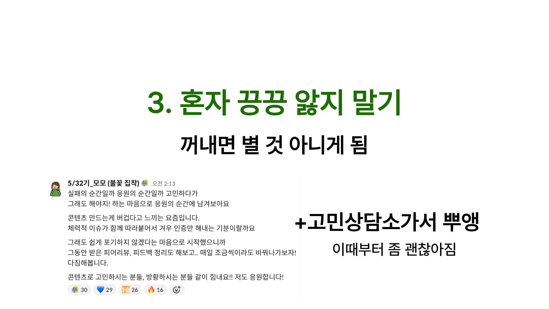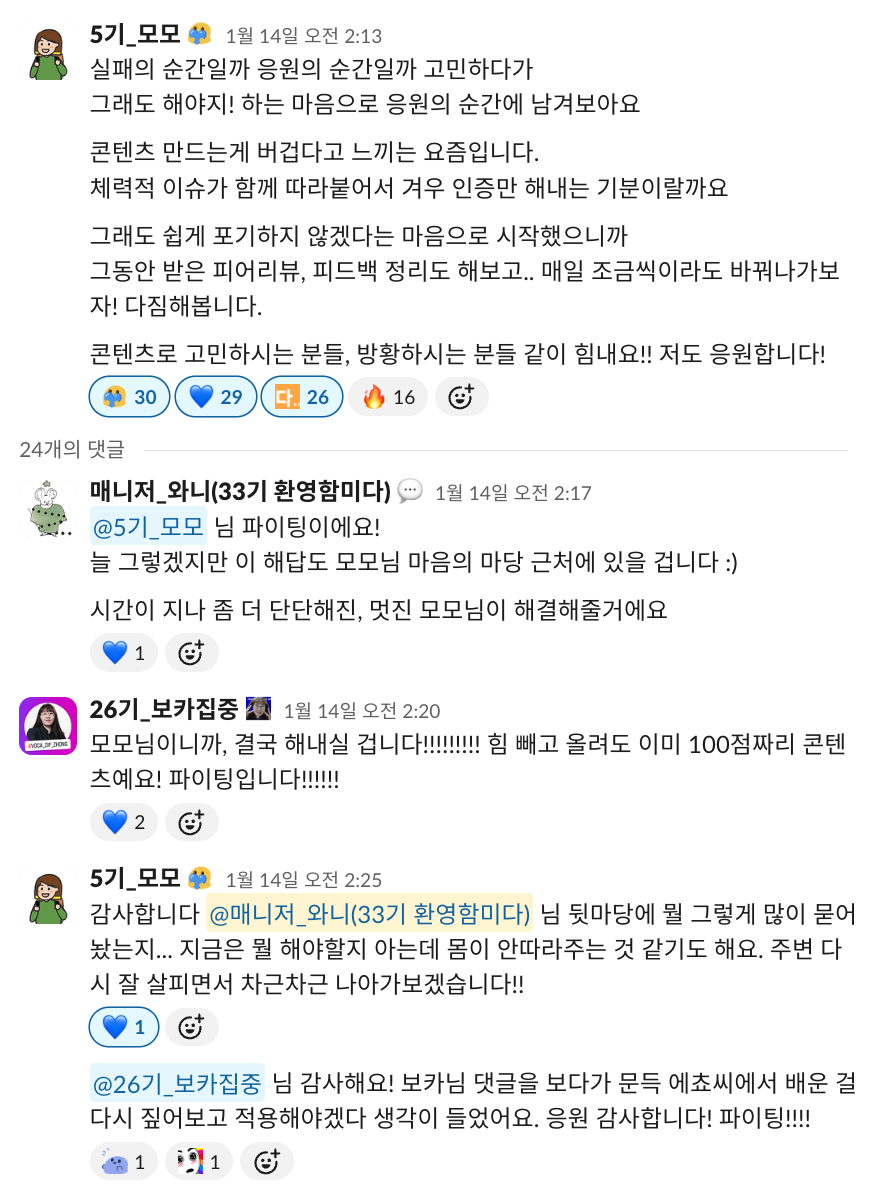 꺼내면 별 것 아니기도 한 일인데 말이에요. 저도 더 혼자 갖고 있다간 괜히 울적해질 것만 같아서 #채널-응원의 순간에 새벽 감성 담아 글을 올렸어요. 스무명이 넘는 멤버들이 위로와 응원, 공감의 댓글을 남겨주었습니다. 얼마나 큰 힘이 됐는지 몰라요.