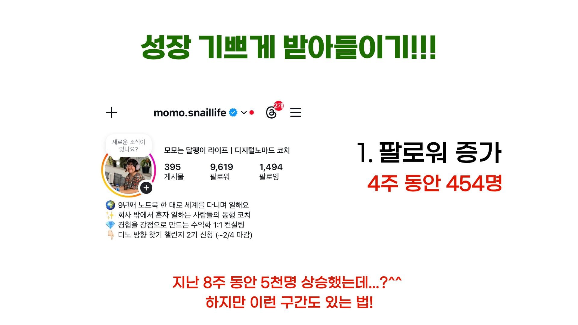 적은 숫자는 아니지만 지난 8주 동안 5천명 상승했던 걸 감안하면 상대적으로 작게 느껴졌습니다. 하지만 원온원노트님 말씀처럼 성장은 계단식이니까요. 이런 기간도 있는 법이겠죠!