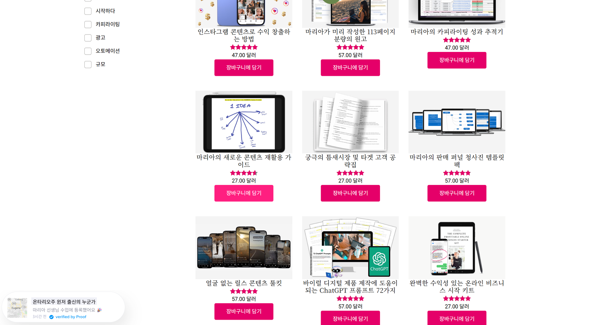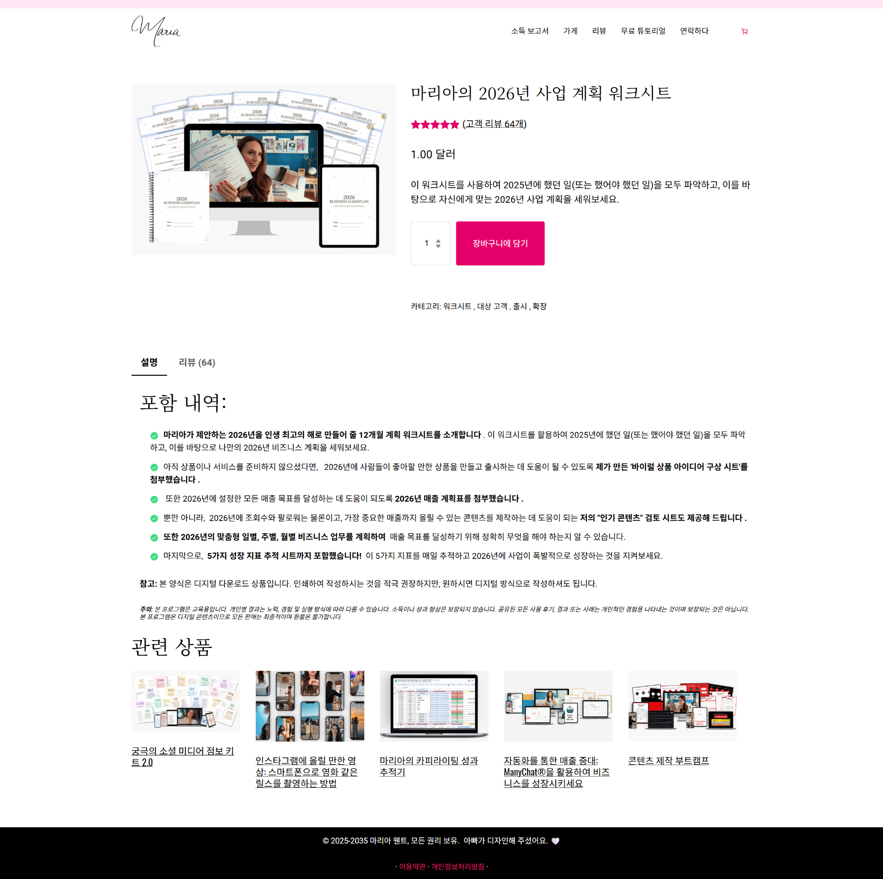 마리아는 현재 전자책, 미니 코스, 온라인 강의 등 로우 티켓(*Low-Ticket, 저렴하고 구매 결정이 쉬운 저가 상품이나 서비스) 디지털 상품을 판매하고 있습니다.