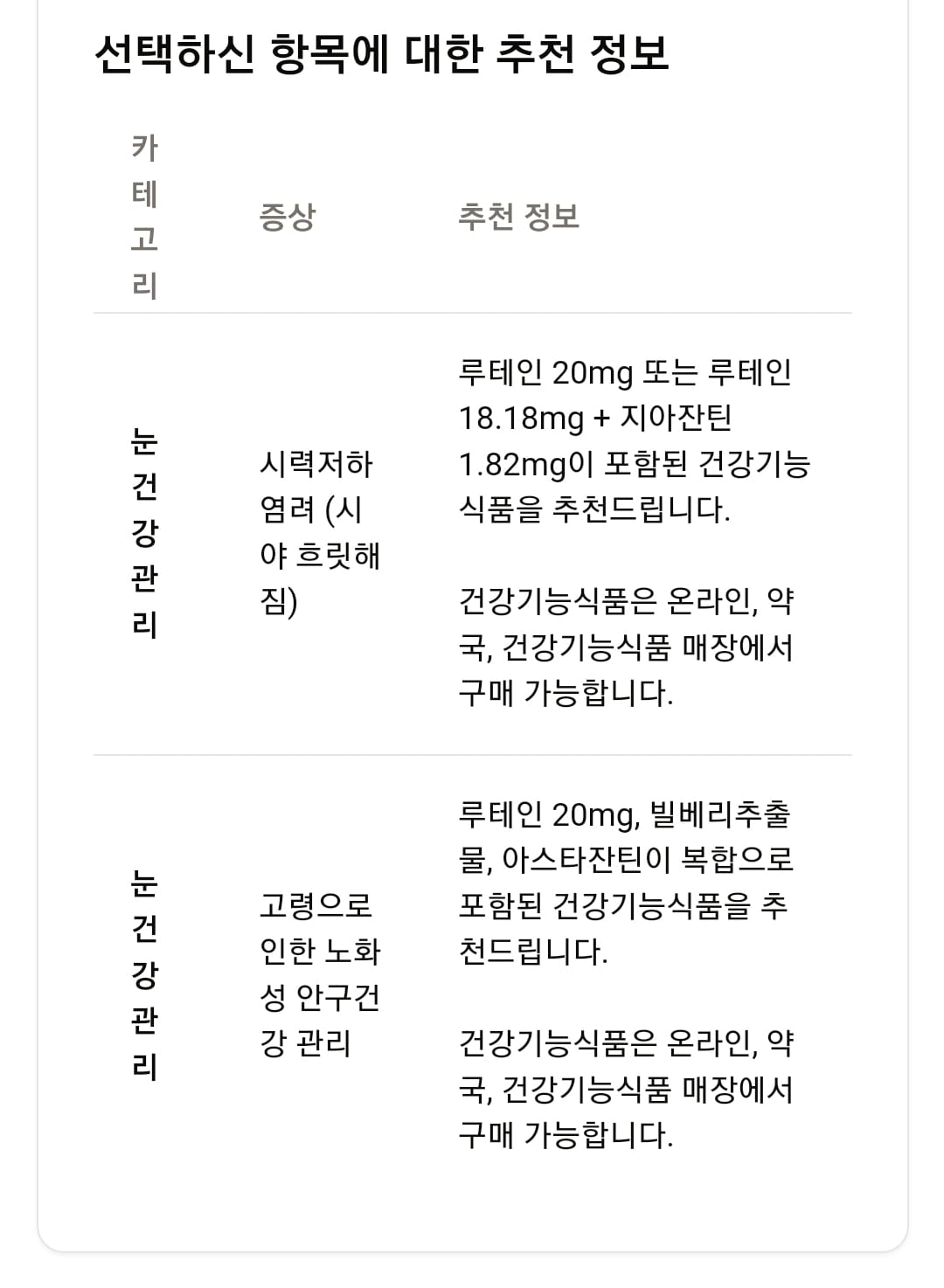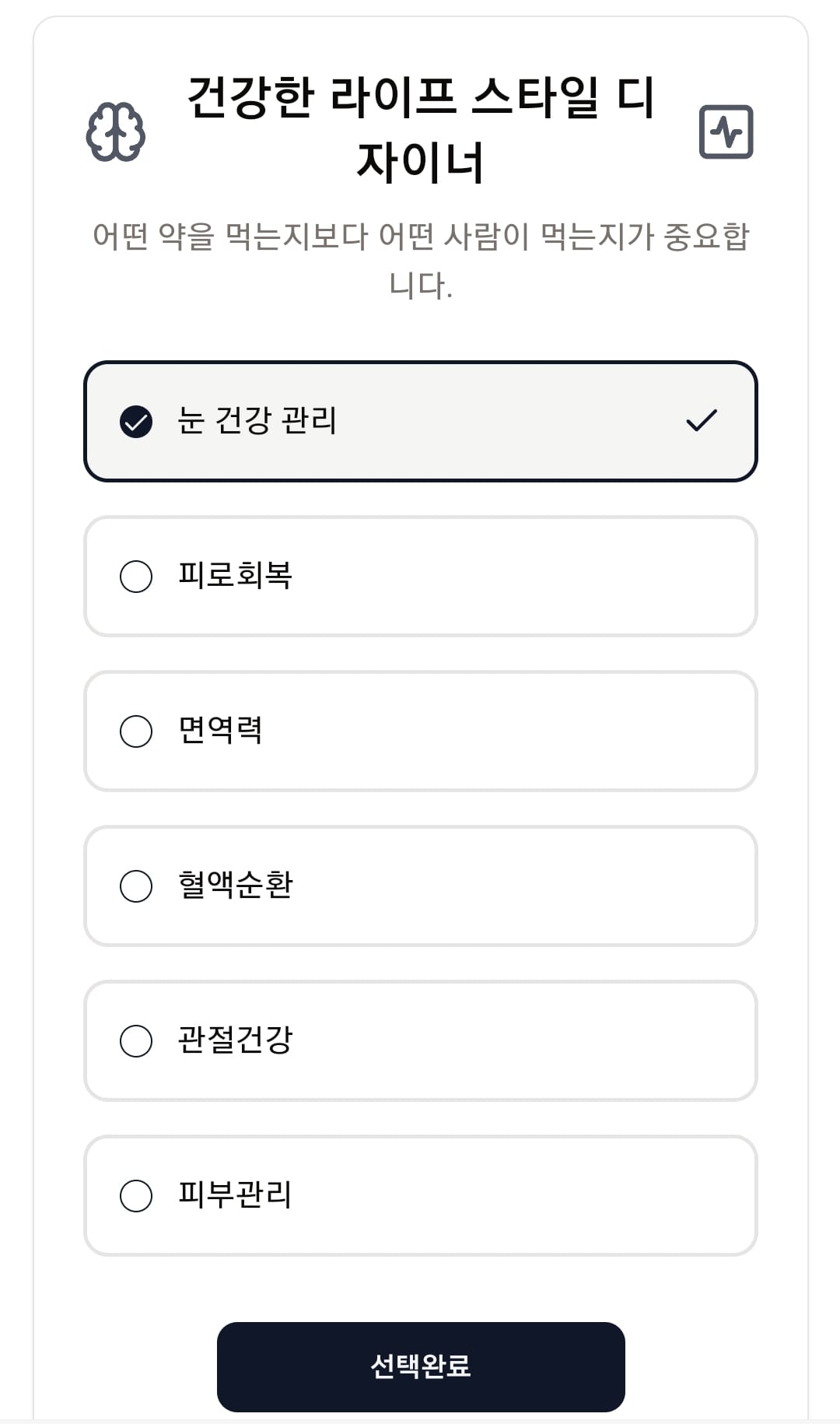 사람마다 불편한 부분이 세부적으로 다르고, 개선하고자 하는 신체적인 증상이 다르다보니 각각 효과를 볼 수 있고 적절한 영양 성분이 다르거든요. 그래서 조금이라도 도움될수 있는 부분이 있을까 하다가 만들어진 웹서비스에요.
