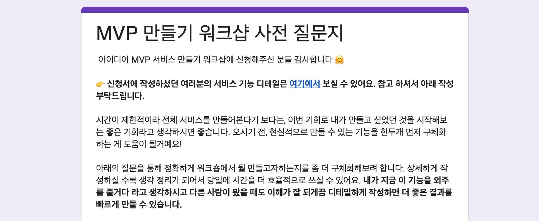 워크샵에 앞서, 무엇보다도 내가 어떤 문제를 해결하고 싶은지 명확히 아는 것이 중요하다는 이야기를 들었습니다. 이를 위해 사전 질문지를 제공받았고, 각 문항에 대한 답을 고민하면서 제한된 시간 내에 구현할 핵심 기능을 정리할 수 있었어요.