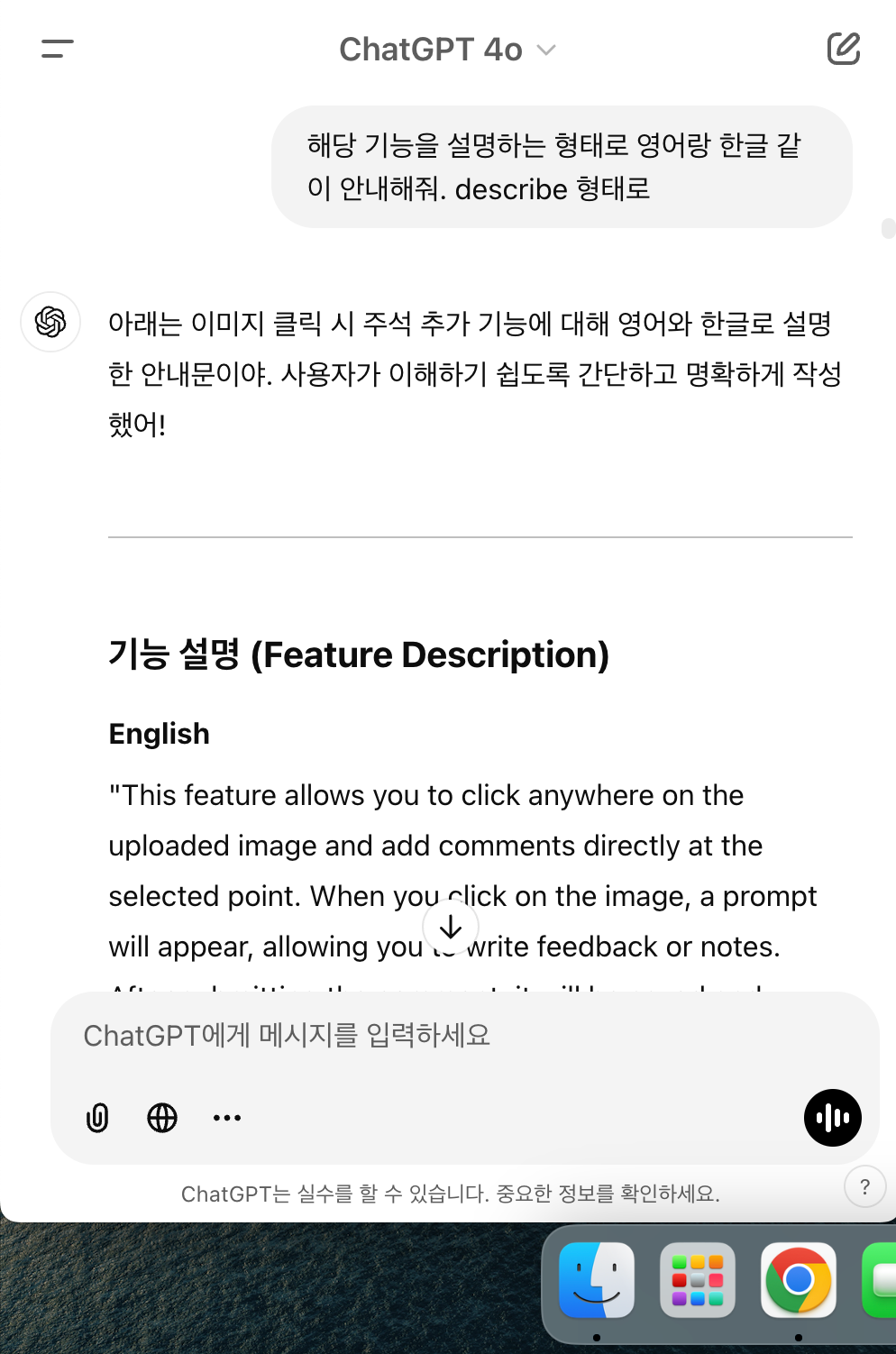 처음엔 ChatGPT에게 영어로 프롬프트 작성을 요청했어요. 하지만 나중에는 한국어로도 원활하게 소통할 수 있다는 점을 알고, 훨씬 편하게 개발을 진행할 수 있었습니다.