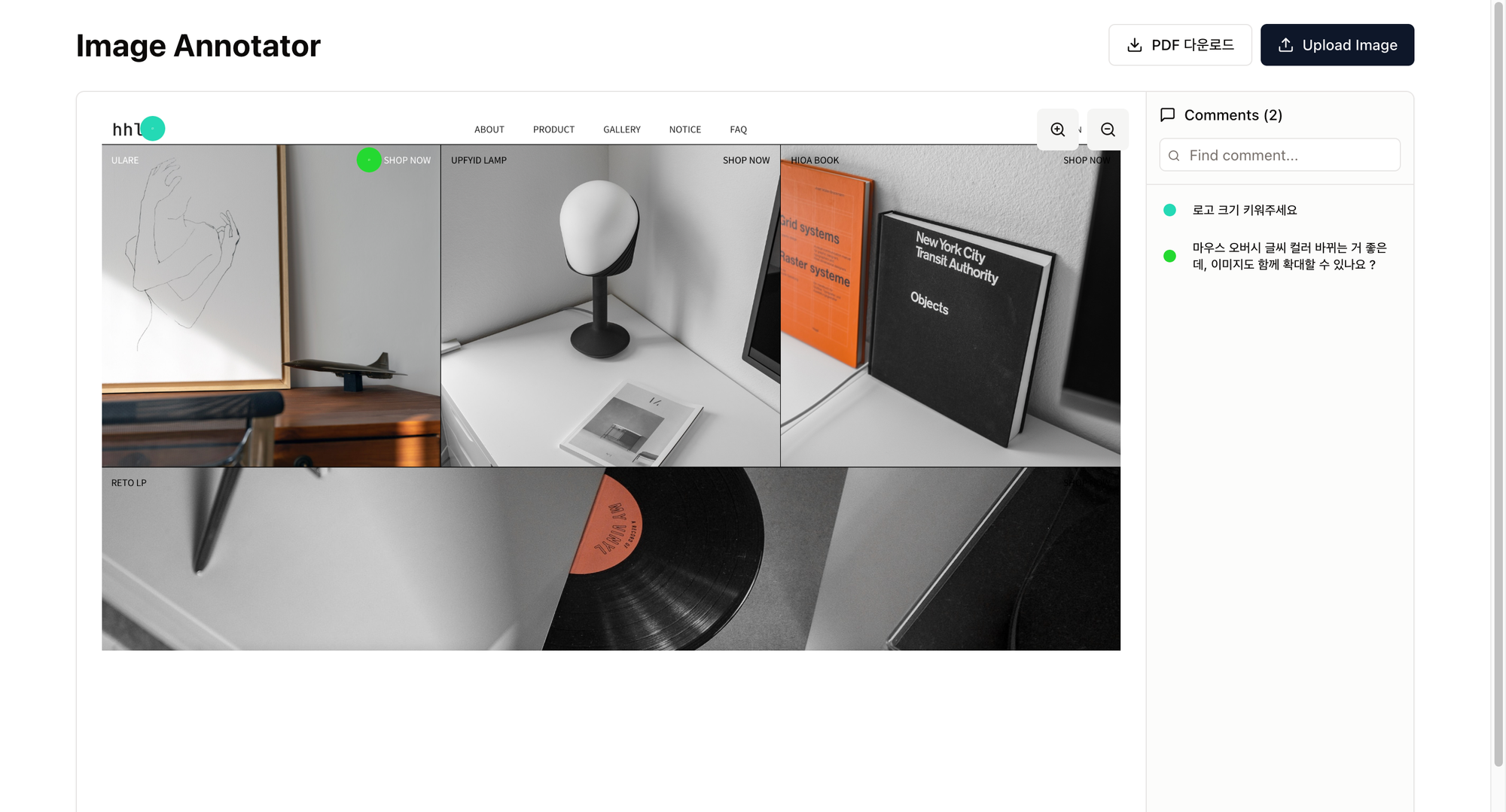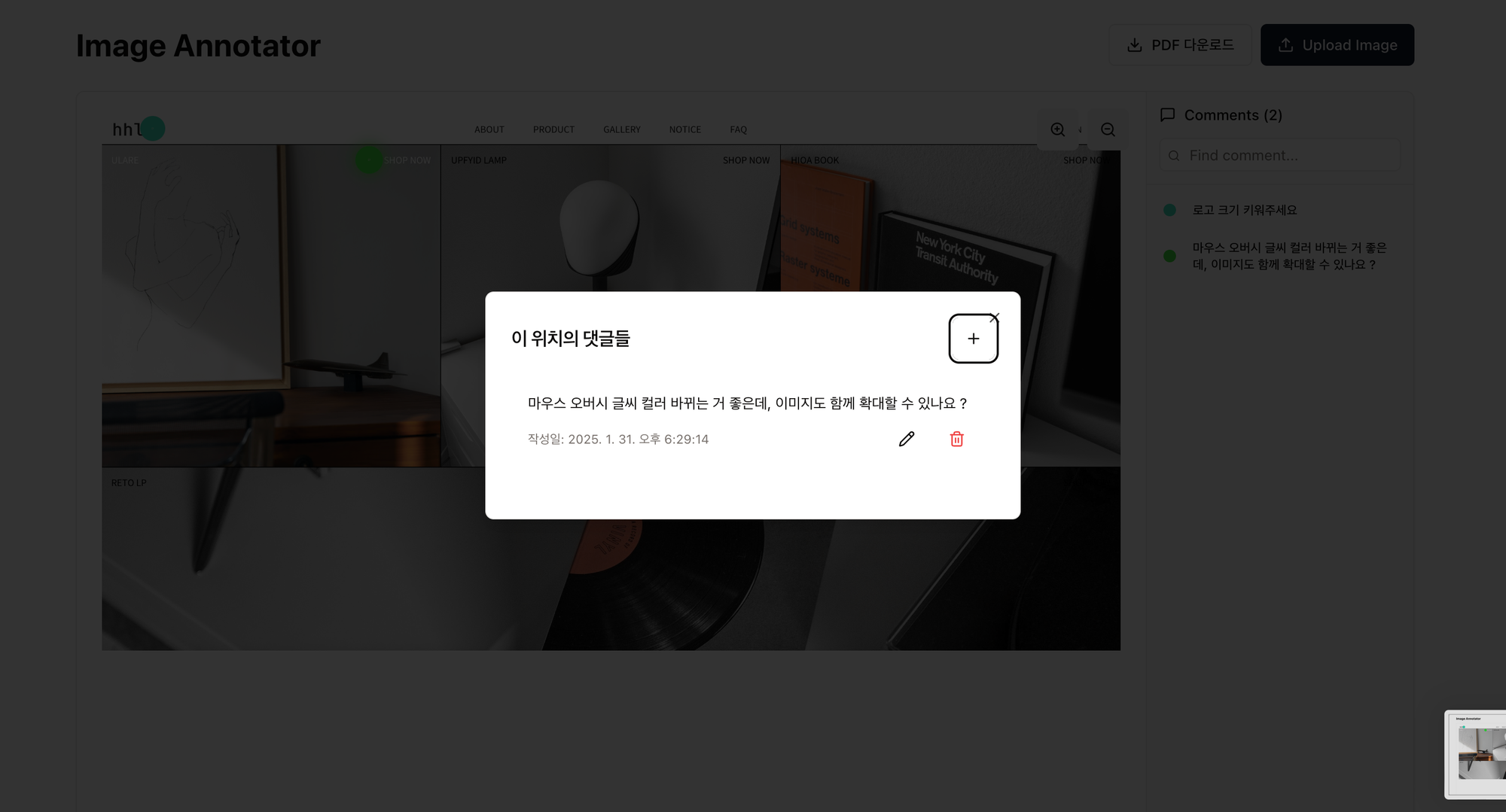 사용자는 디자인 이미지(예: 웹사이트 시안)를 업로드한 후, 특정 위치에 바로 피드백을 남길 수 있습니다. - 핀 포인트 코멘트 기능
