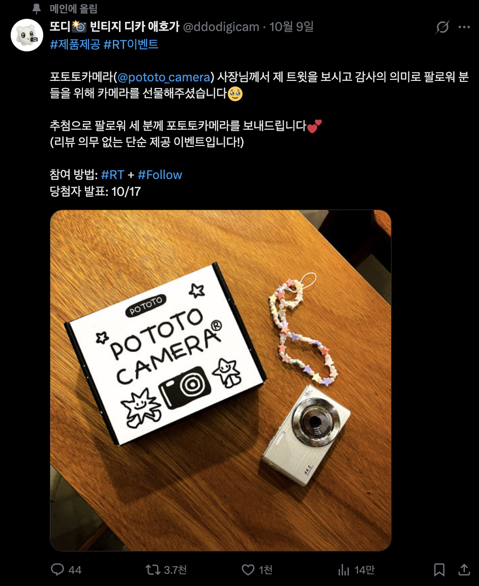 한 연예인이 뽀또또님의 감성 디지털 카메라를 사용하는 장면이 포착되었고, 이를 본 X 유저가 자연스럽게 제품 브랜드명을 언급하면서 바이럴이 시작된 것이었죠.