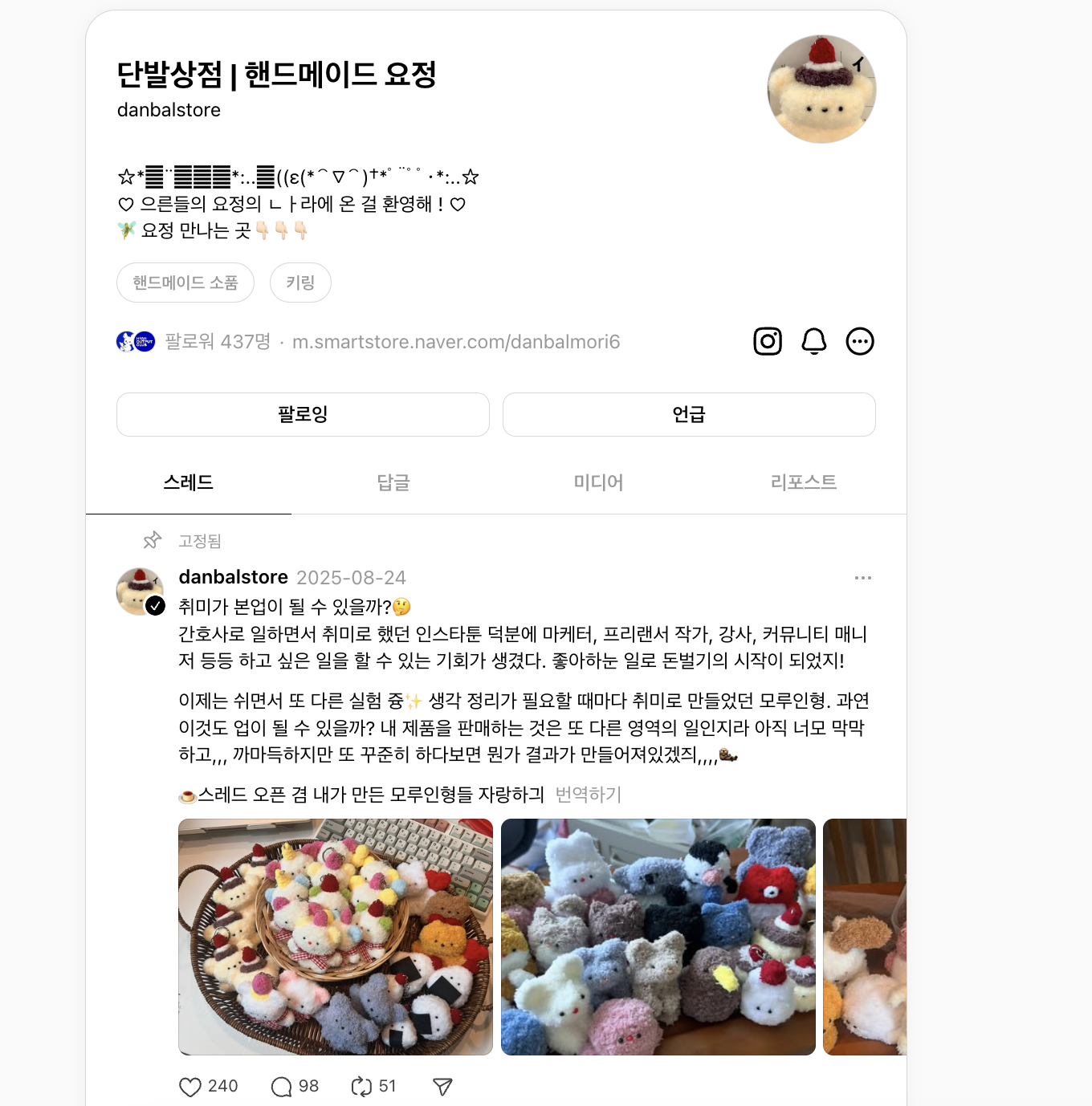 꾸준히 채널을 운영하자 스레드는 누적 4.2만 회 조회수를 찍었어요. 그 흐름을 타고 플리마켓 2곳에 참여했고, 제안도 3곳이나 받았습니다.