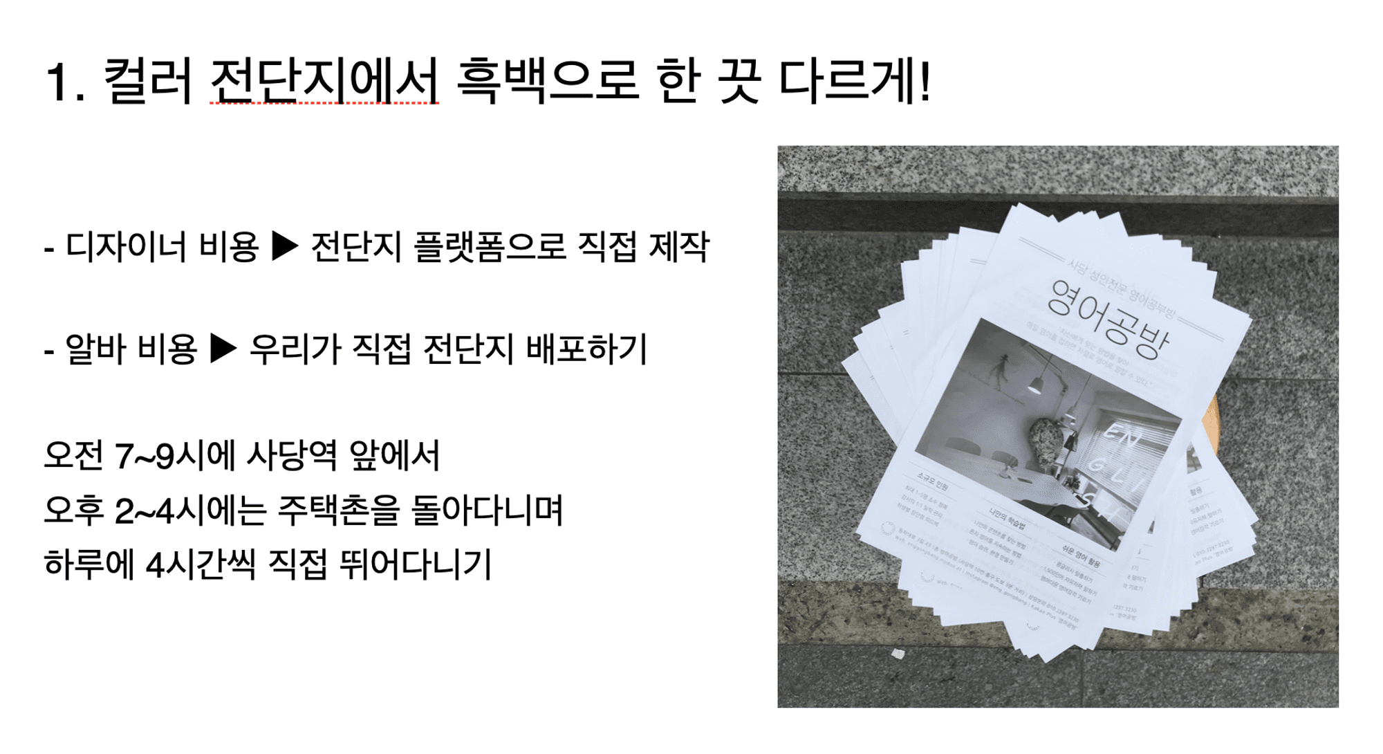 새로운 걸 계속 도전하기엔 돈도 많이 들고 시간도 오래 걸리더라고요. 그래서 익숙한 것을 타고 들어와서 한 끗 다른 것에 눈길을 줄 수 있게 했어요. 컬러 전단지를 흑백으로, 수업 홍보안내문을 매거진으로, 엄마표영어를 '부모'를 위한 콘텐츠로 바꾸는 식이었죠. 이렇게 지속적으로 테스트하면서 피드백을 받아 업데이트했더니 재등록률 90%가 넘고 대기리스트까지 생겼어요.