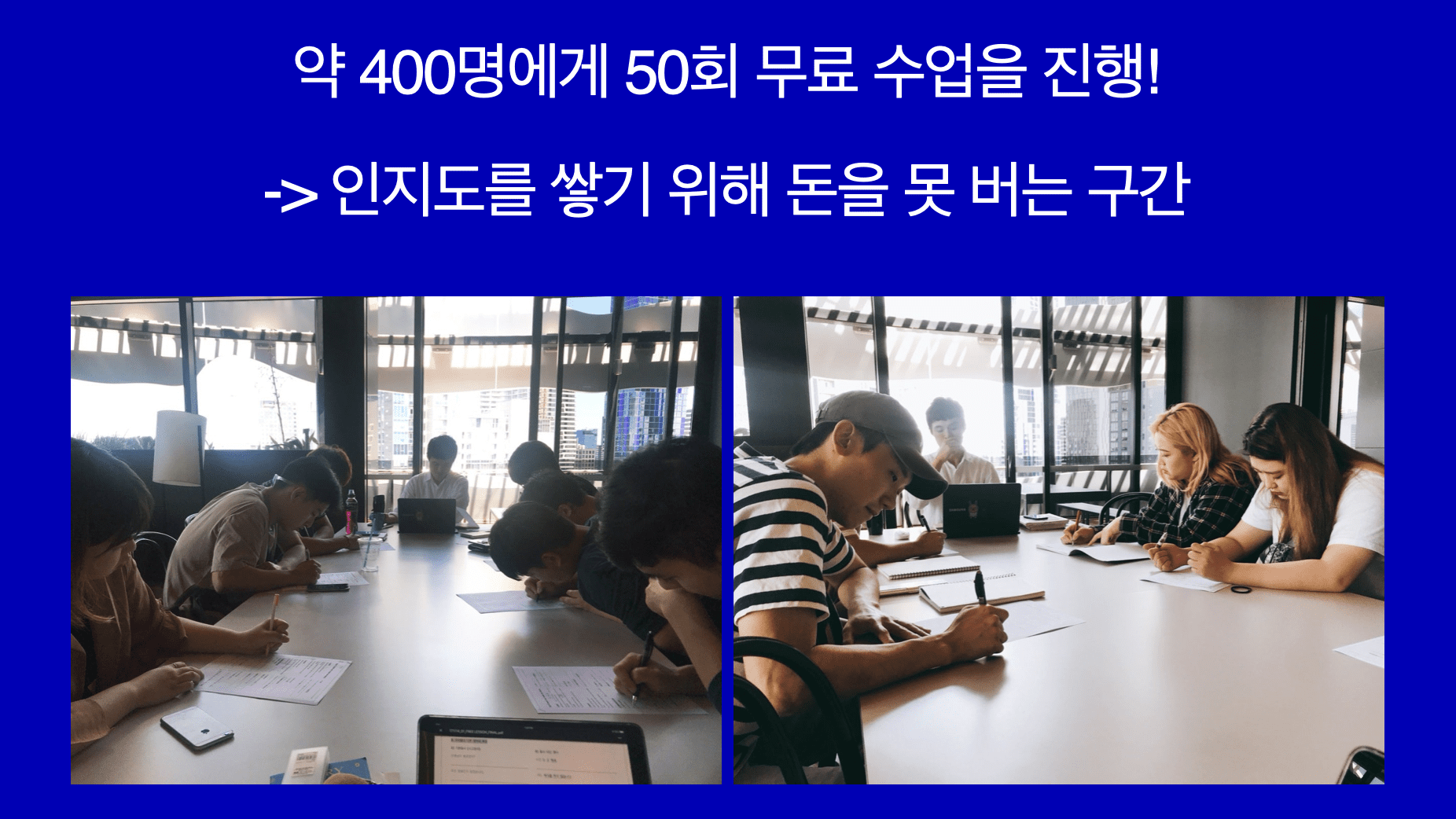 처음 시작했을 때 인지도도 낮고 후기도 없었어요. 그래서 무료 서비스로 우리를 알리기로 했죠. 시립도서관에 무료 수업 포스터를 붙이고, 아파트 커뮤니티 공간을 활용해서 약 400명에게 50회의 무료 수업을 진행했어요. 무료여도 최대한 다 알려주고, 받기 미안할 만큼 자료에 힘을 줬죠. 이렇게 수익이 없더라도 인지도를 쌓는 구간이 있다는 걸 당연하게 생각했어요.