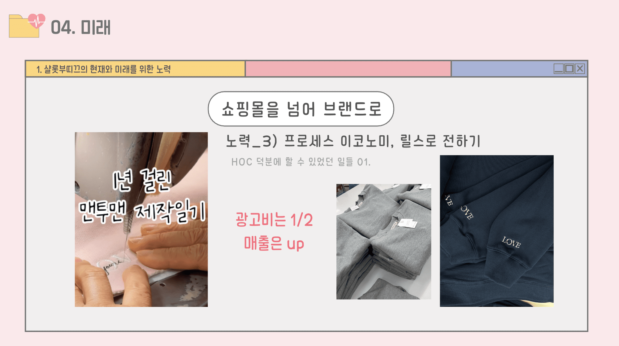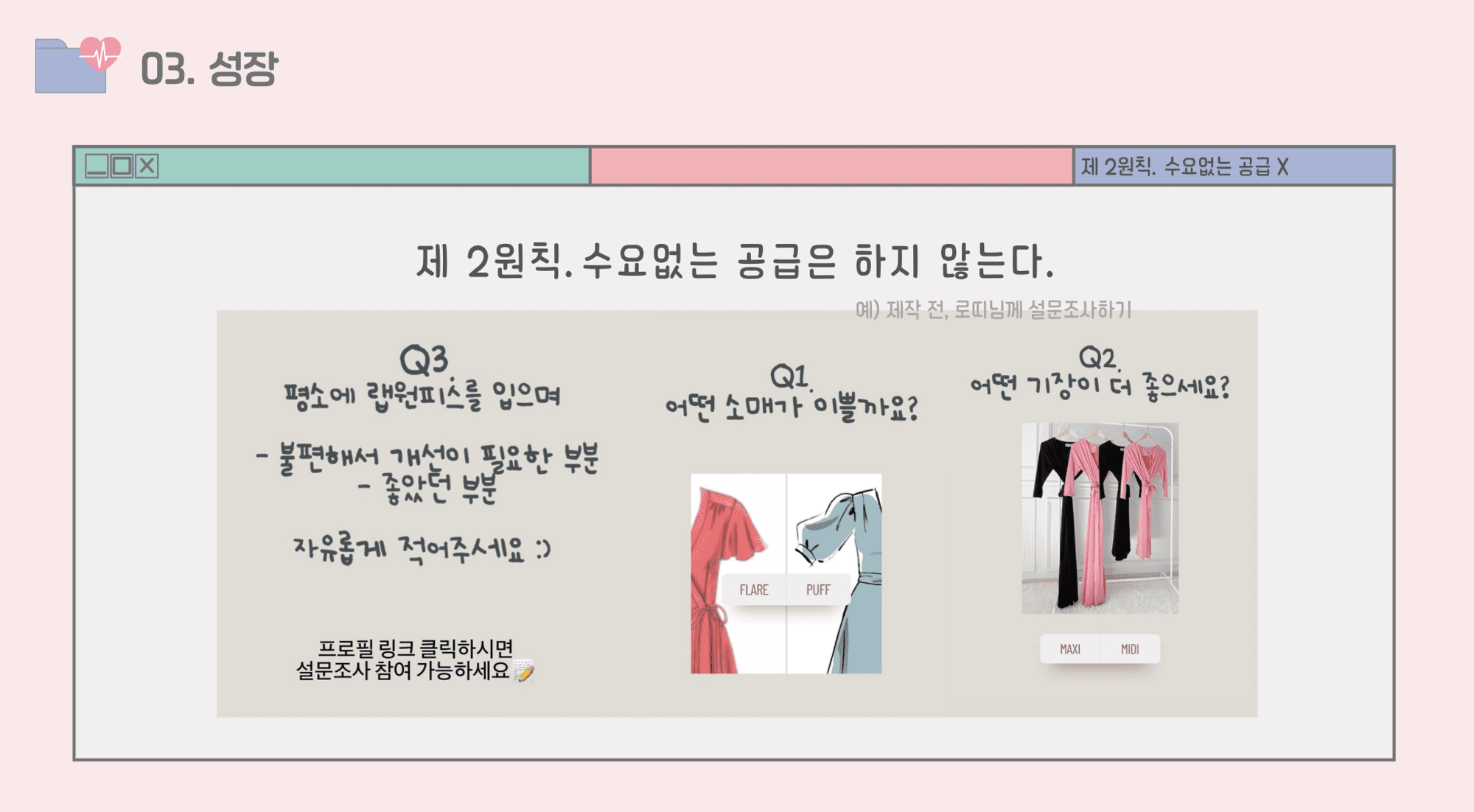 저희는 항상 고객님들의 의견을 듣고 의류를 만들었어요. 무조건 제작하기 전에 우리 옷을 사주실 고객님들께 설문조사를 하고 그 의견을 반영해서 만들었죠. 이렇게 하니 고객님들의 니즈에 딱 맞는 옷을 만들 수 있었어요.