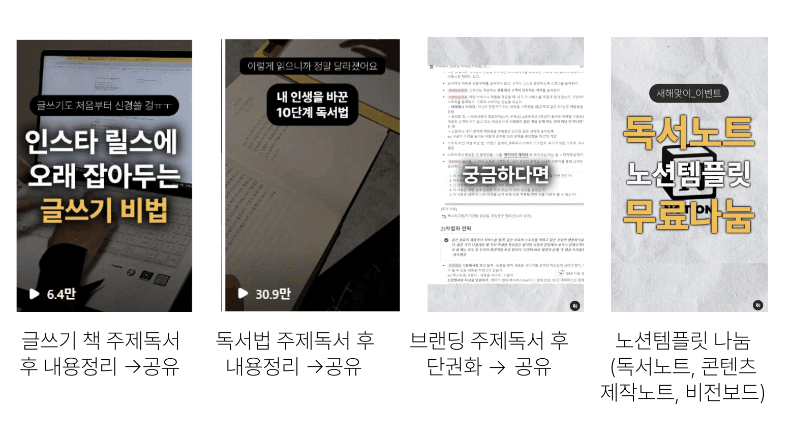 예를 들어, 글쓰기와 관련된 여러 권의 책을 읽고 인스타그램 릴스에 사용할 수 있는 '후킹 메시지'를 작성하는 글쓰기 비법 자료를 제공하기도 했죠. 또한 브랜딩에 관한 다양한 책을 읽고 핵심 내용을 한 페이지로 압축해 제공하기도 했습니다.