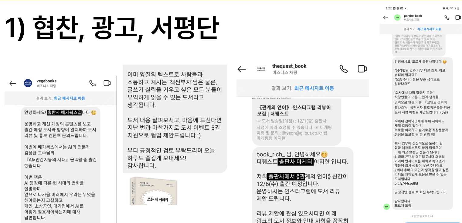 독서를 주제로 하는 크리에이터인 만큼, 책찐부자님은 여러 출판사로부터 다양한 제안을 받게 되었습니다. 단순히 책을 협찬해주는 수준을 넘어, 서평단 참여 요청과 함께 광고 제의까지 이어졌죠.