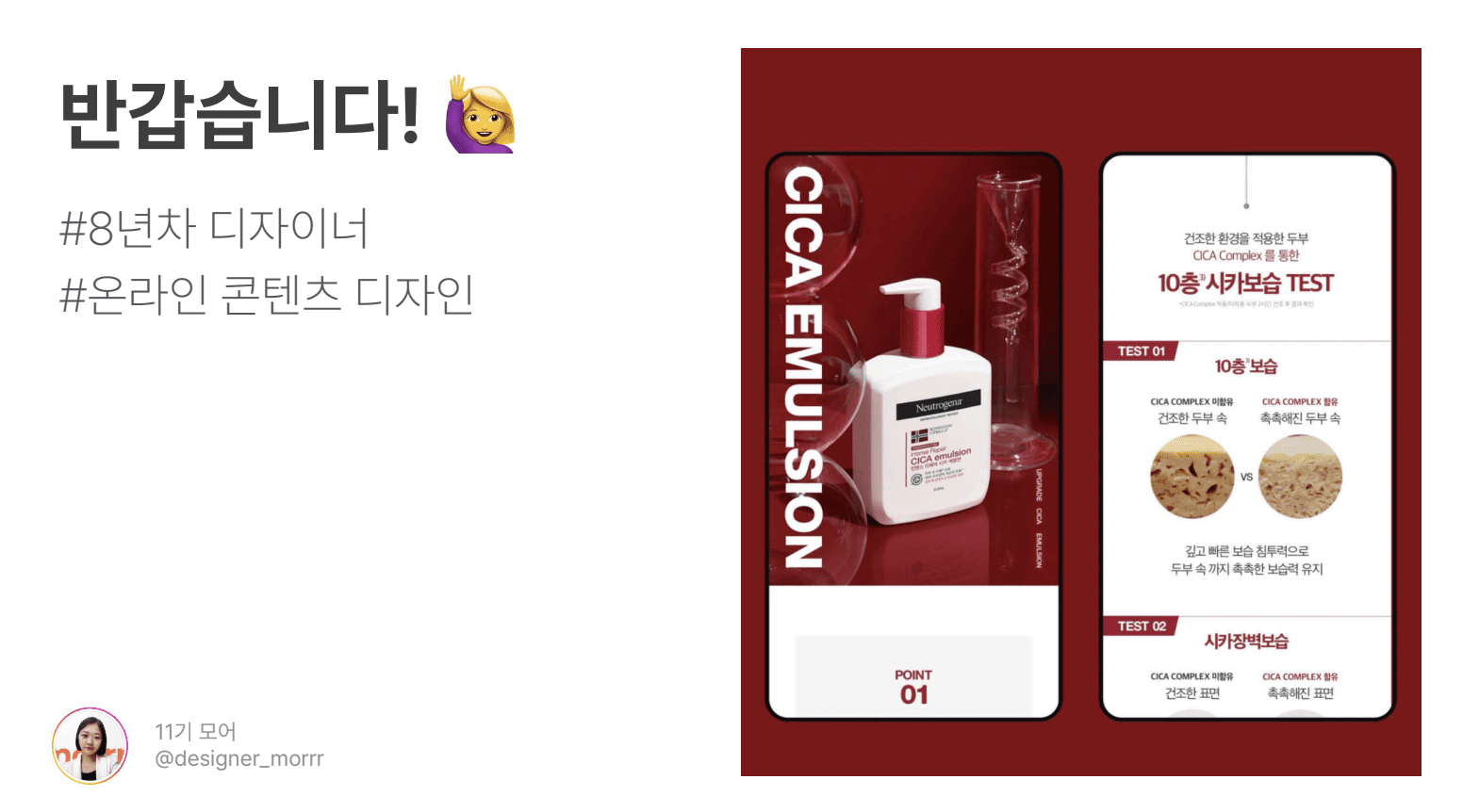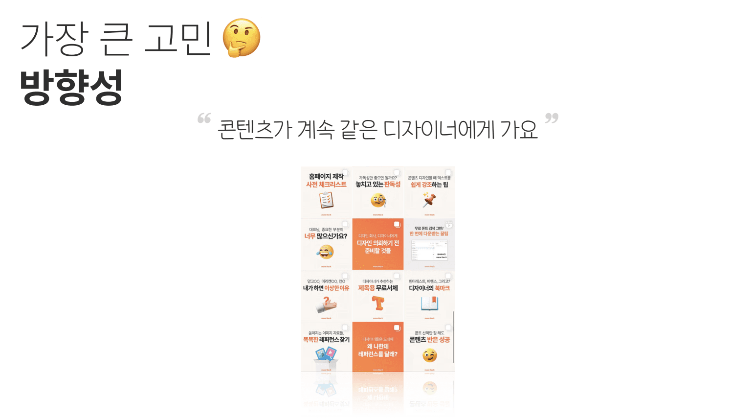 사업 초기, 모어님이 가장 고민했던 부분은 회사를 알리고 브랜드 방향성을 확립하며 꾸준히 SNS 계정을 운영하는 일이었는데요. 그동안 운영했던 디자인 계정들이 정작 '디자인 서비스를 필요로 하는 사업자'들에게는 도달하지 못하고, 같은 업계의 디자이너들에게만 소구되는 한계가 있었기 때문이에요.