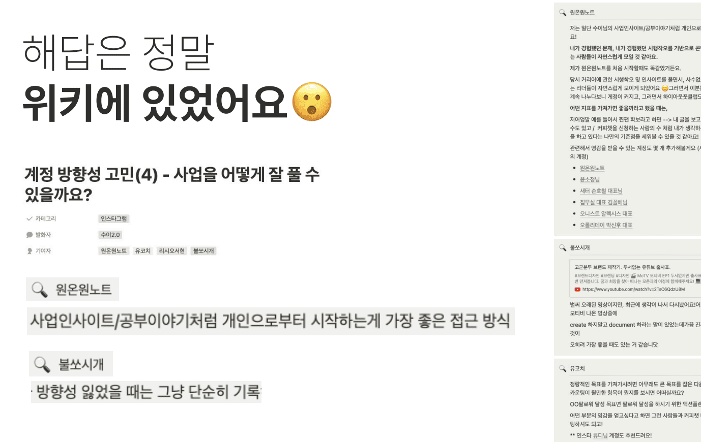 방향성을 고민 하던 끝에 모어님은 '하이아웃풋클럽 위키'를 통해 해답을 찾게 됩니다. 바로 본인의 사업 일기를 콘텐츠화하여 디자인이 필요한 사업자들에게 다가가기로 한 것이죠. 여기에 더해 실제 고객들의 고민을 담은 작업 프로세스와 사례들을 인스타그램 릴스로 제작하기로 결정합니다.