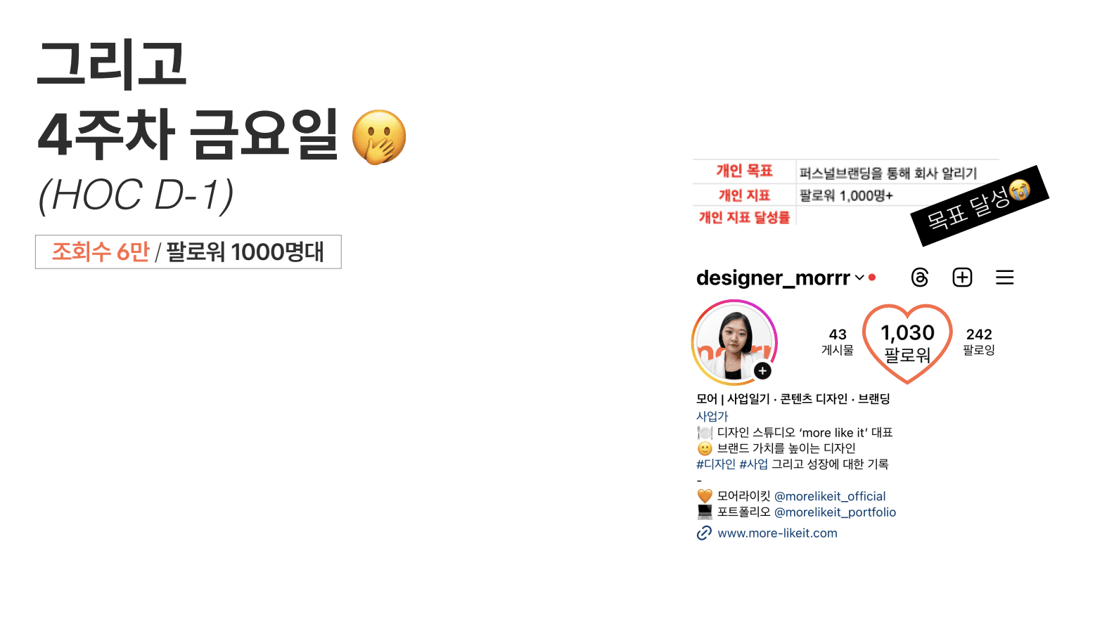 그 결과 4주차 목요일에는 조회수 5만 회를 돌파하는 동시에 신규 비즈니스 문의까지 받게 됩니다. 이렇게 전략적으로 제작된 단 하나의 콘텐츠로 모어님은 조회수 6만 회와 목표로 했던 팔로워 수를 달성할 수 있었어요.