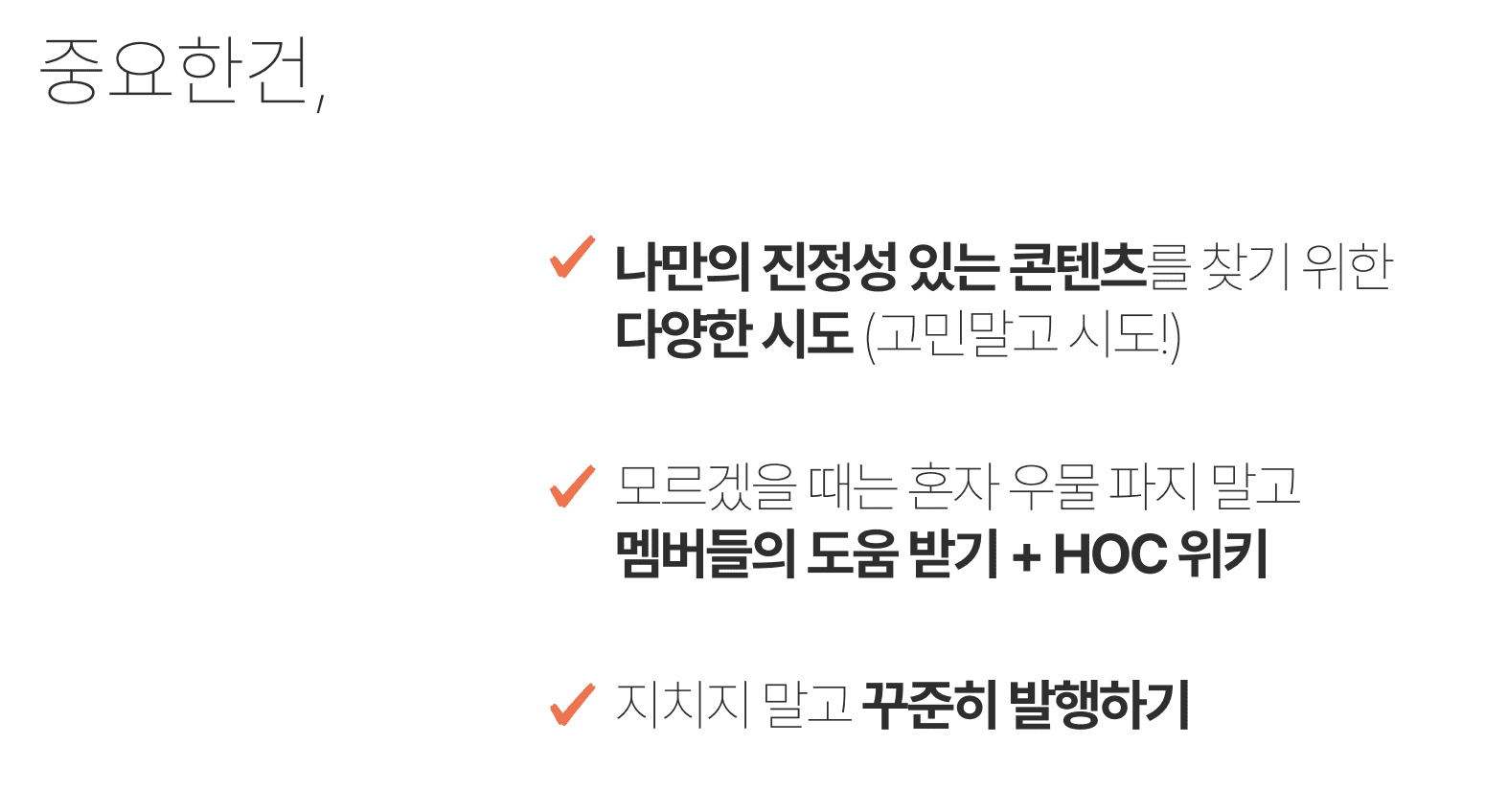 - 진정성 있는 자신만의 콘텐츠를 찾기 위해 다양한 시도를 해볼 것 (고민보다는 실행이 우선)