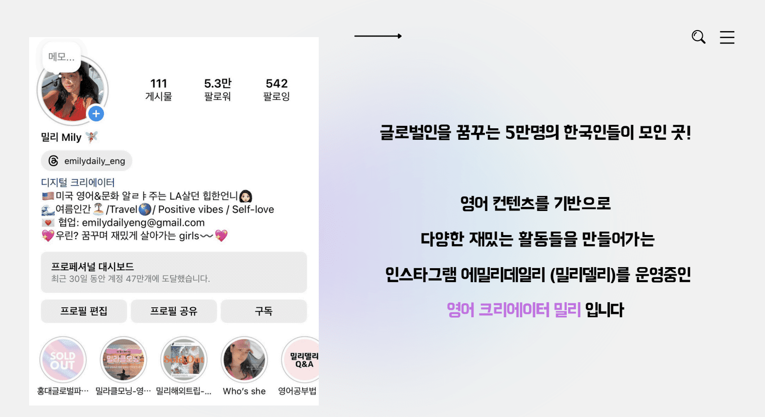 밀리님에게 인스타그램은 단순히 수익을 넘어 인생을 바꾼 계기가 되었어요. 약 100여 명의 팔로워들이 밀리님의 수업을 듣는 단골 고객으로 변했고, 영어 과외를 해볼까 고민하던 시절은 언제였냐는 듯 인스타그램 하나로 수요가 공급을 못 따라가는 상황까지 벌어졌죠.