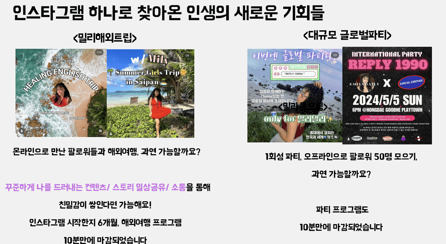 나아가 밀리님은 온라인으로 만난 팔로워들과 해외여행을 떠나는 <밀리해외트립>, 50명의 팔로워가 모이는 대규모 글로벌 파티 등 색다른 프로젝트들도 성공적으로 진행했죠. 이 모든 것이 가능했던 이유는 꾸준한 콘텐츠를 통해 자신을 알리고, 소통을 통해 팔로워를 진짜 팬으로 만들었기 때문입니다.