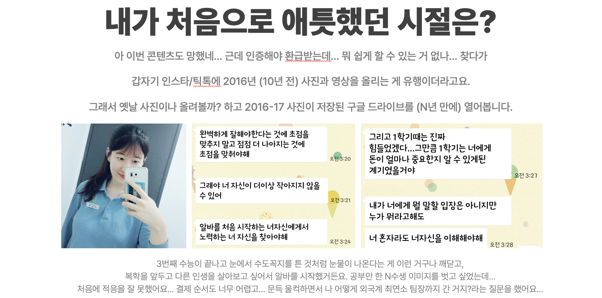 그래서 제 20대 이야기로 1년 넘게 미뤄 온 자기소개를 해보기로 했습니다.
