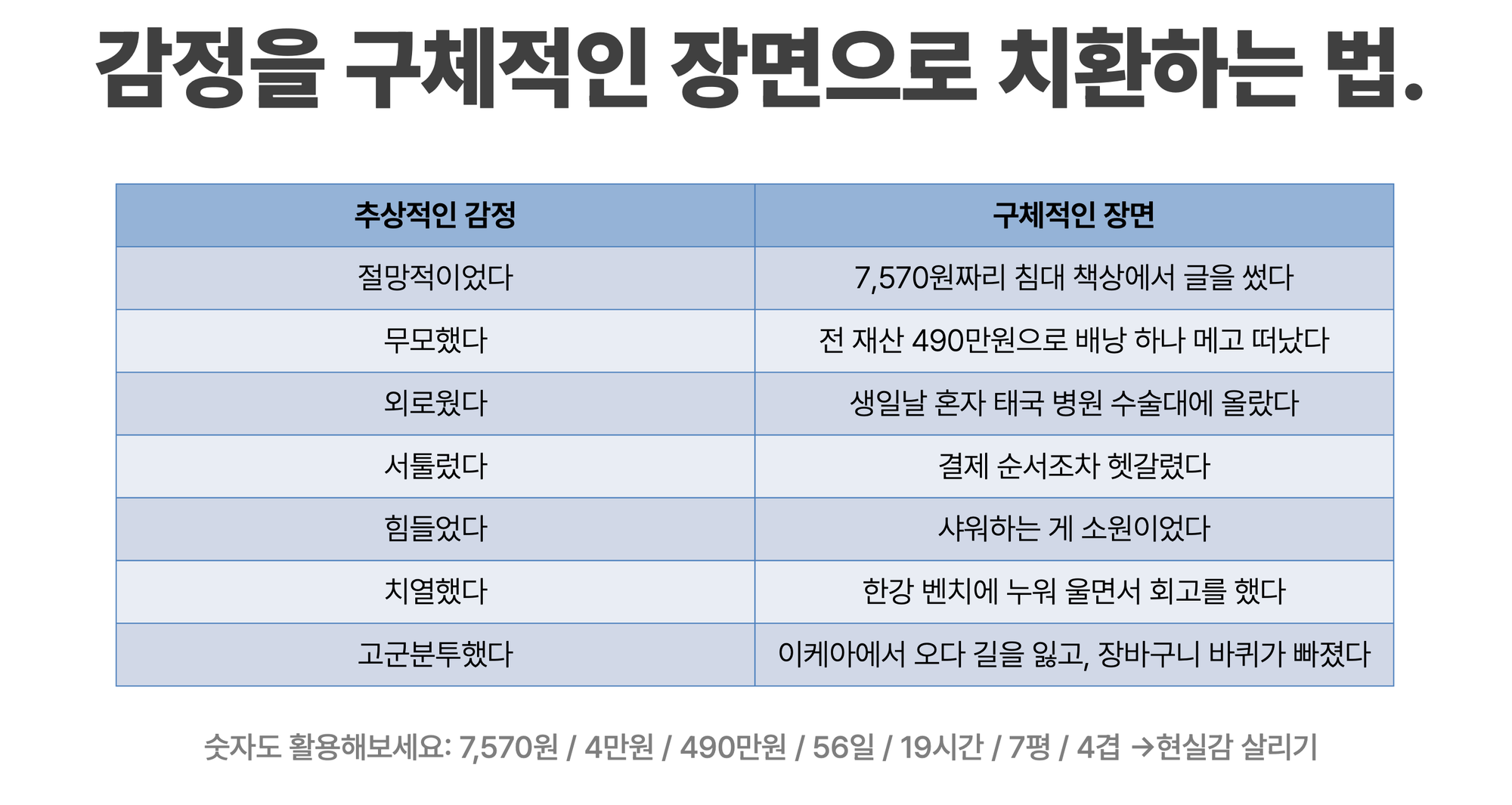 3️⃣ 감정을 설명이 아닌 묘사로 바꾸세요