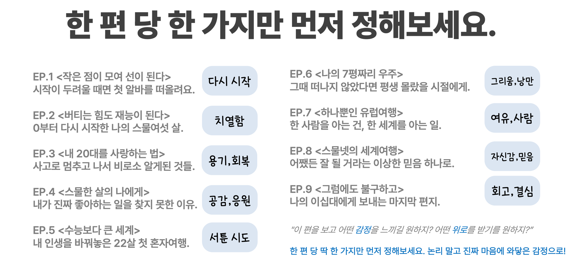 각 편을 기획할 때 스스로에게 먼저 물어보세요.