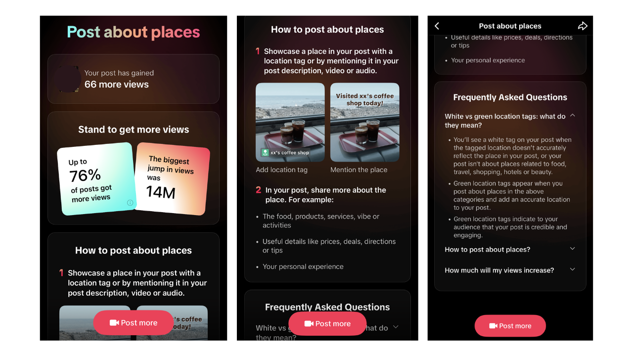 예를 들어, 장소 태그를 포함한 영상을 올리면 틱톡은 다음과 같은 풀페이지 가이드를 노출합니다.