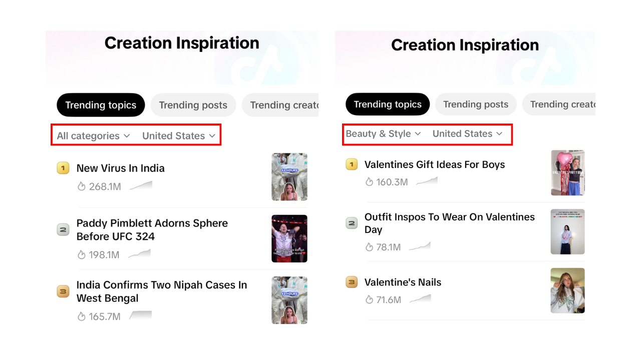 혹시라도 크리에이터가 '소재'가 떨어져 콘텐츠 제작을 그만두는 일이 없도록 영감(Inspiration) 대시보드도 앱 안에서 모두 확인이 가능합니다.