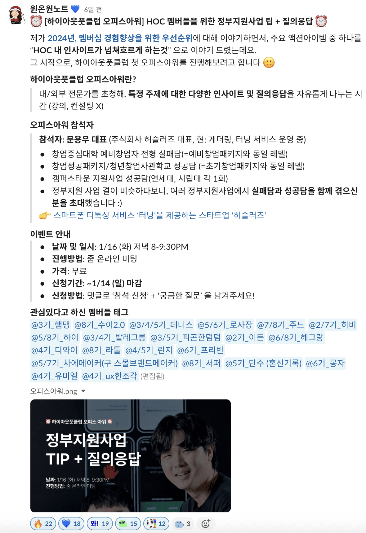 이번에 개최된 제1회 하이아웃풋클럽 오피스아워 - 정부지원사업 편은 하이아웃풋클럽 멤버들에게 창업의 길을 명확히 하고, 정부지원사업 지원을 전략적으로 접근하는데 큰 도움이 될 것 같습니다. 허슬러즈 문용우 대표님 덕분에 실질적인 조언과 정보를 얻을 수 있었고, 서로의 경험을 공유하며 성장할 수 있는 좋은 기회가 되었습니다.