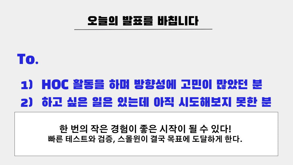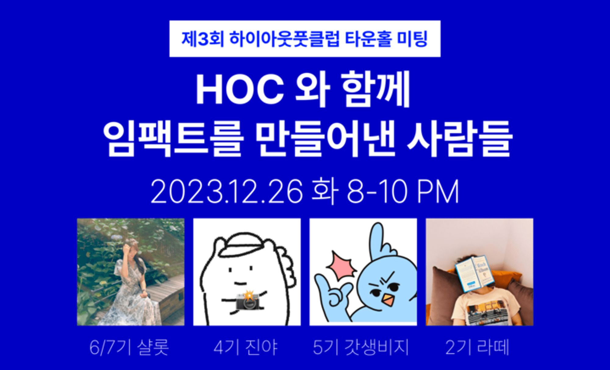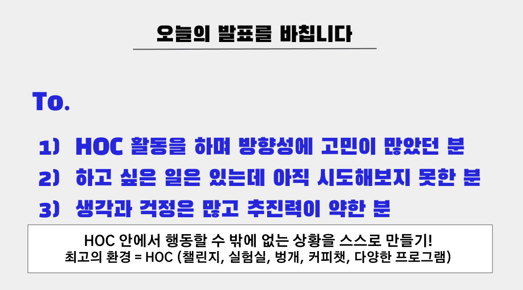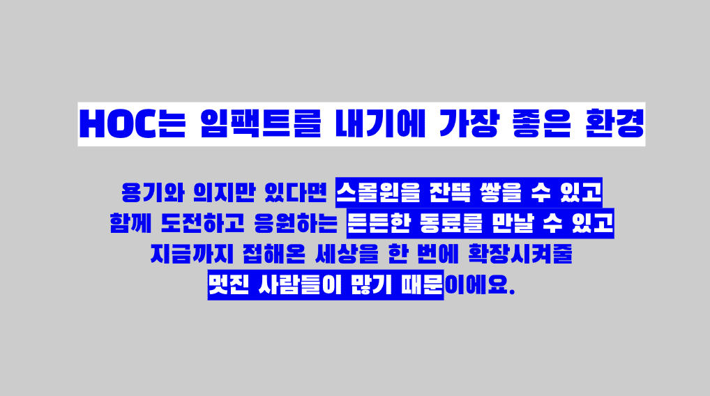 - 한달간 HOC 내 소식 업데이트 + HOC 7가지 가치를 잘 표현하는 멤버들을 초대해 미니 세션 + HOC 에게 무엇이든 물어보세요와 같은 구성으로 이뤄져요.