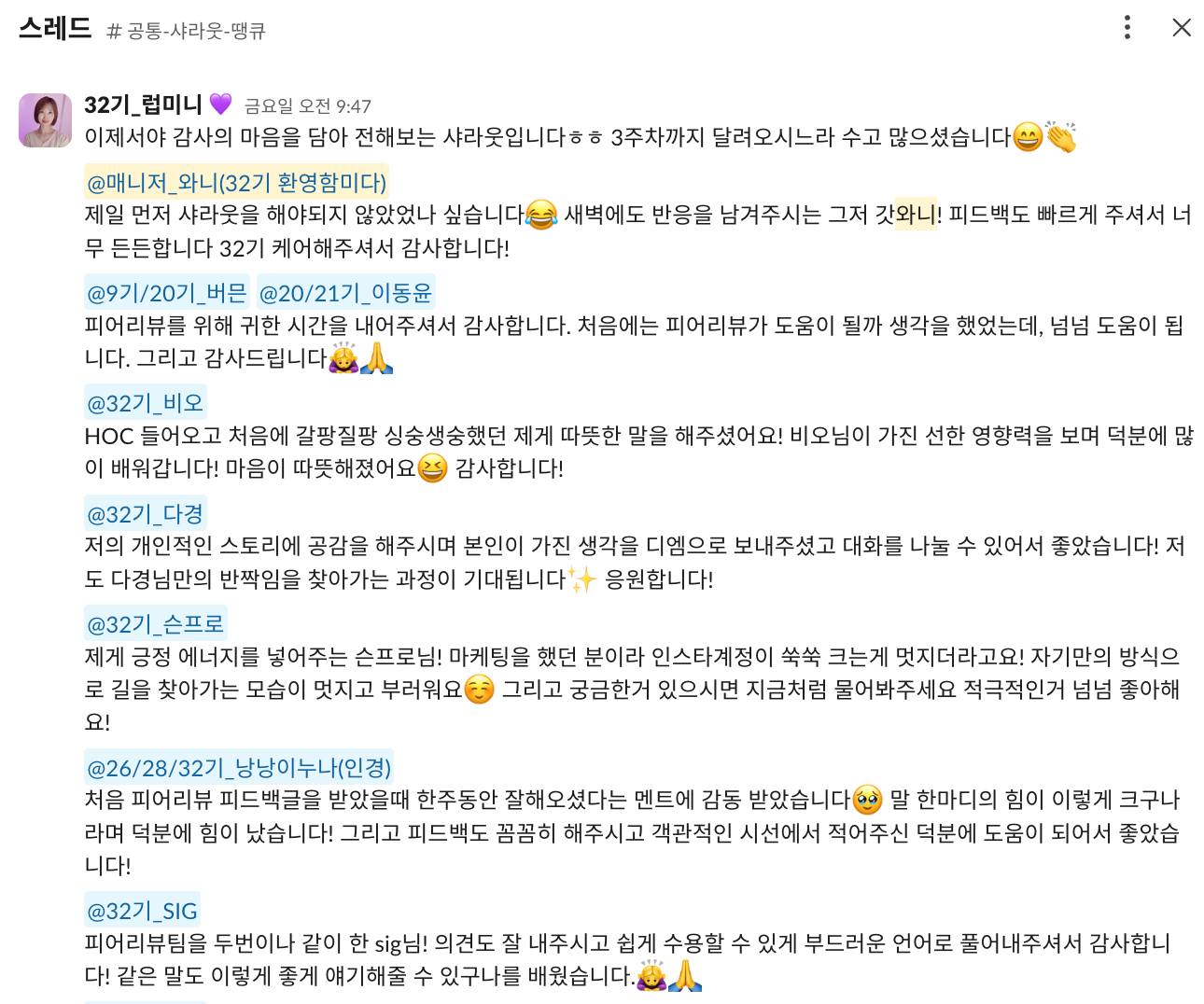 이 문장들은 32기 멤버들이 3주차 회고에서 직접 남긴 기록입니다.