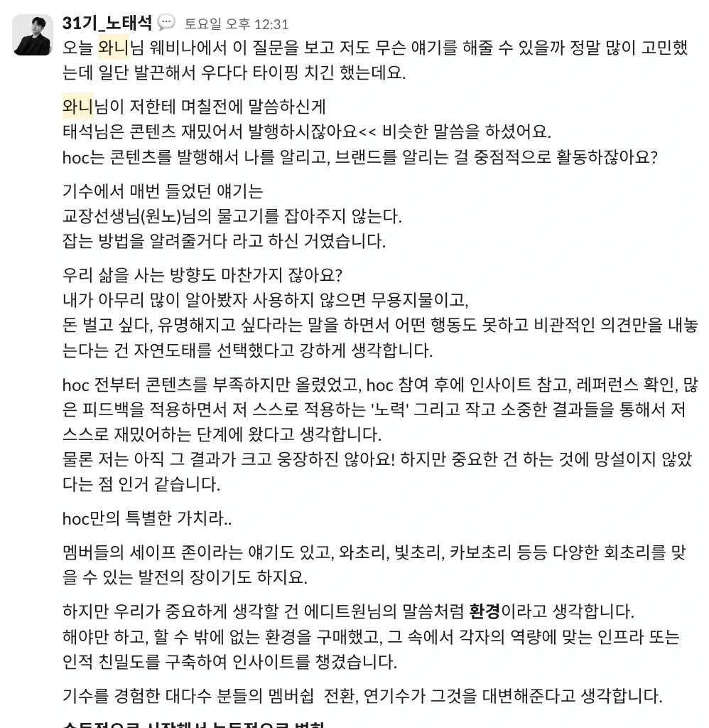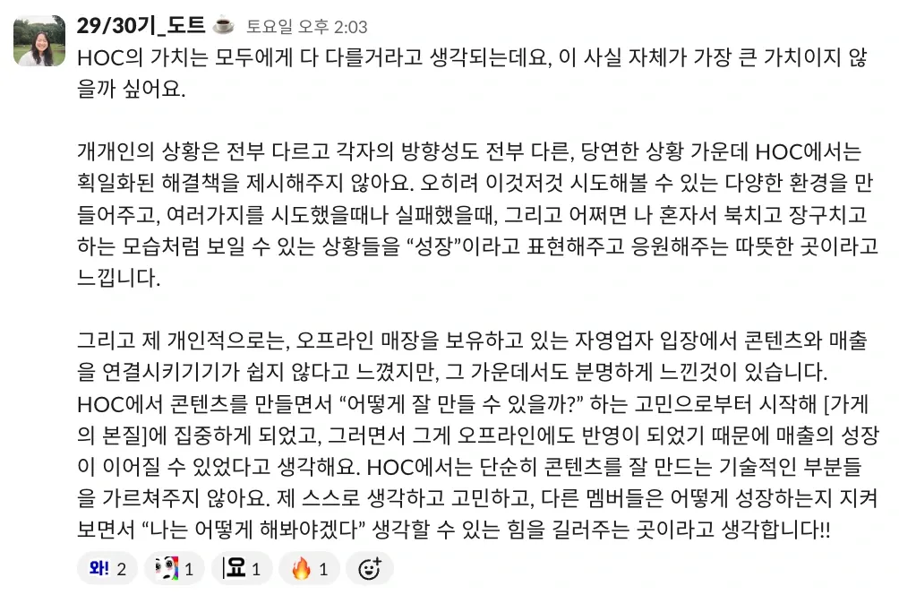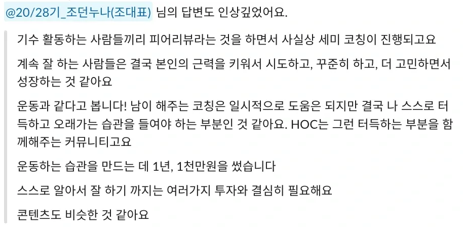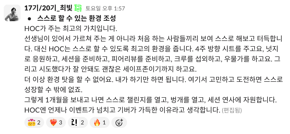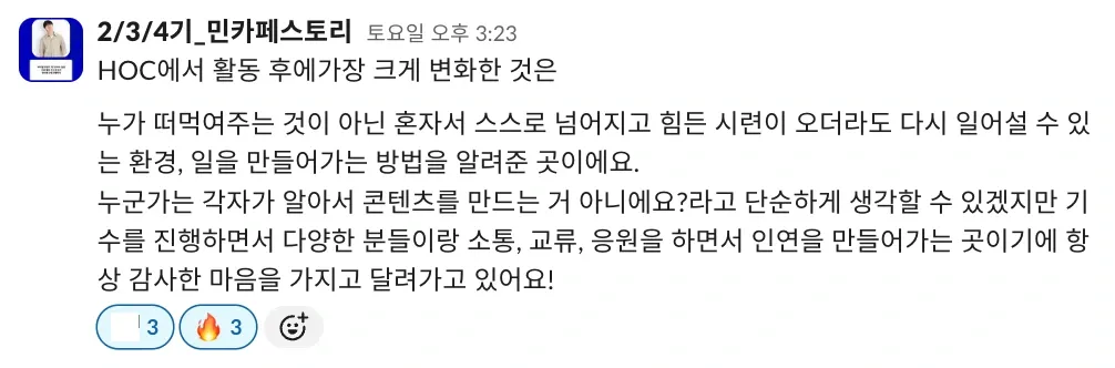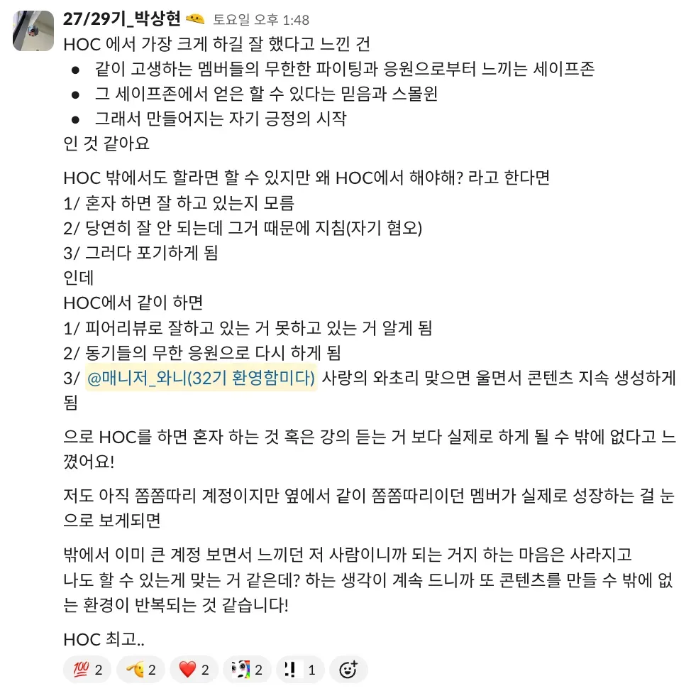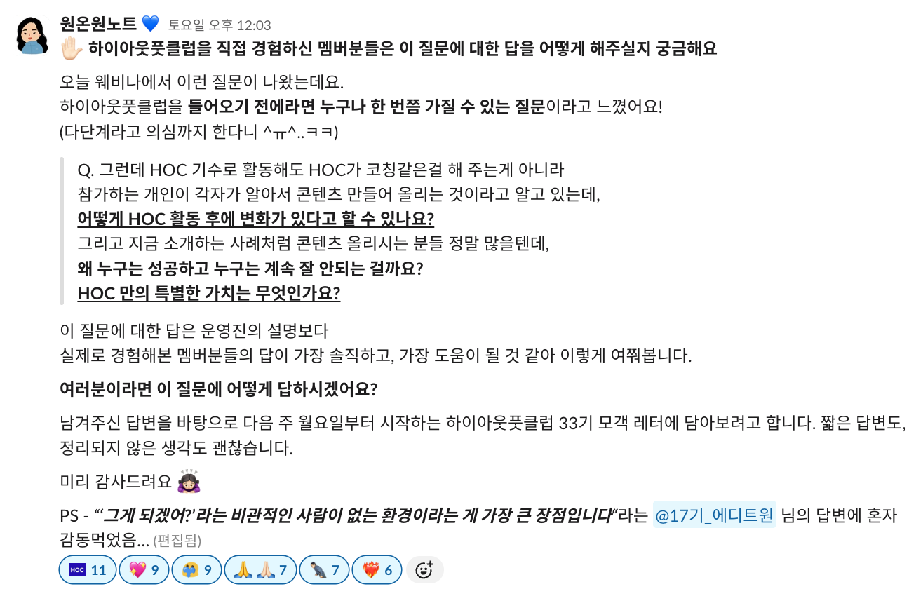 저도 이제야 처음 기수 활동을 하고, 왕성하게 하이아웃풋클럽에 푹 젖어 들었다고는 말하기 부끄럽지만 이렇게 따듯한 시선을 가진 사람들과 함께하는 커뮤니티가 있다는 든든함이 저를 더 나은 사람이 되고 싶게 만들거든요.