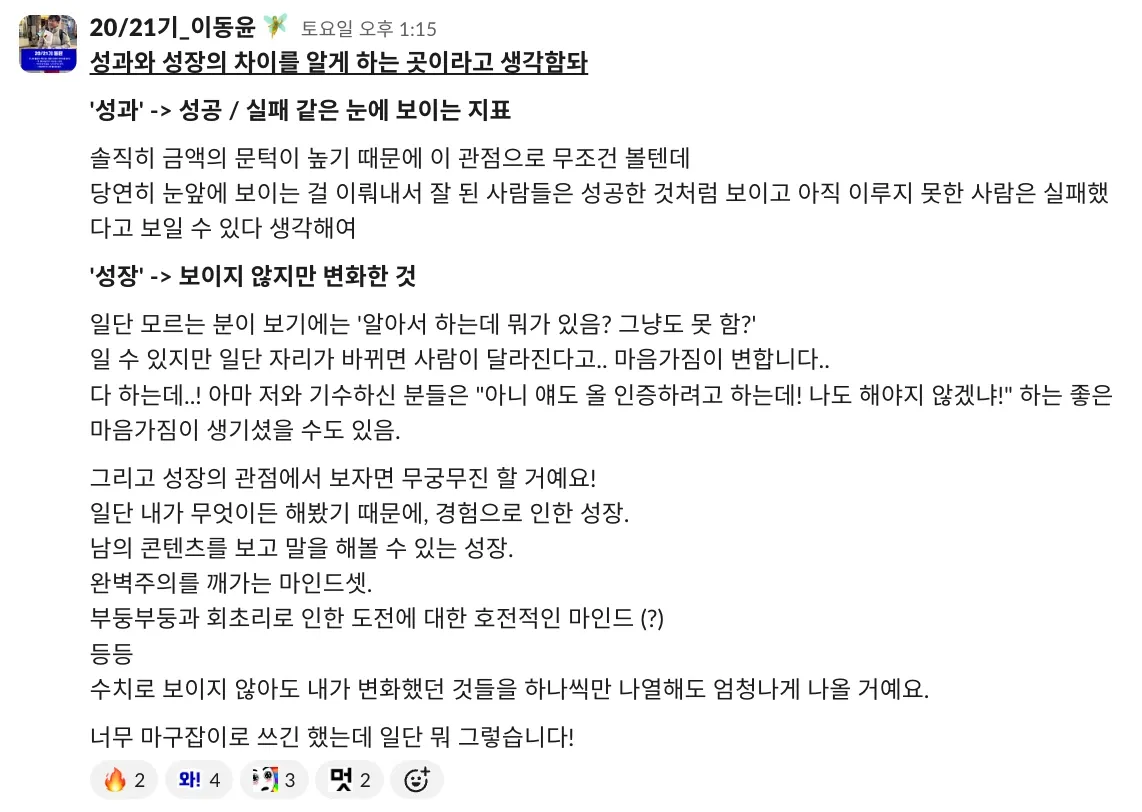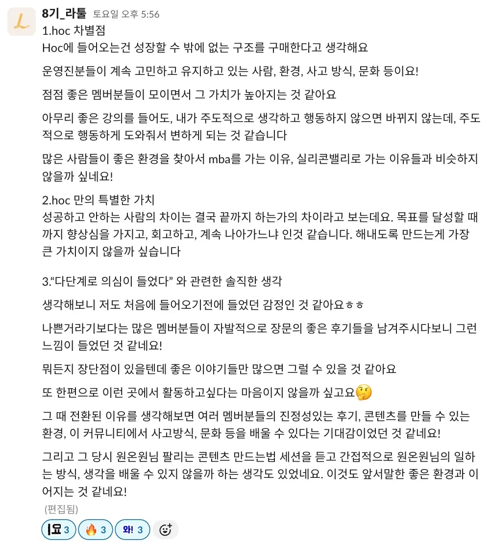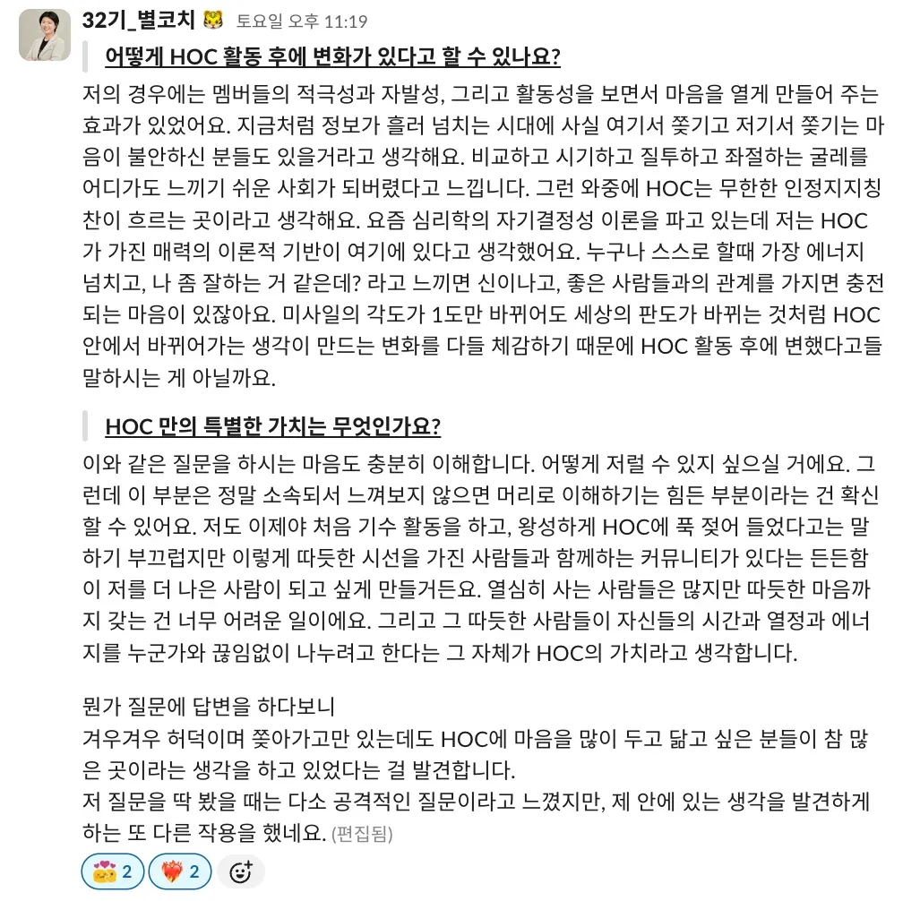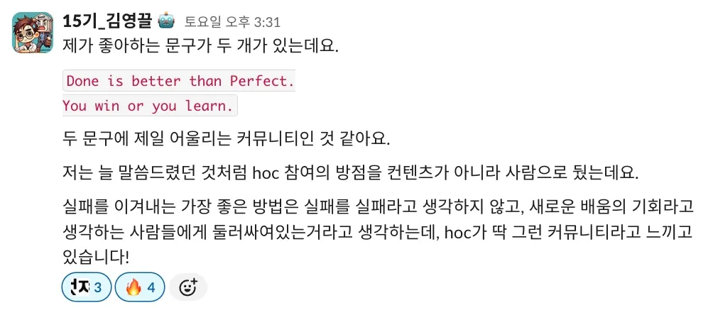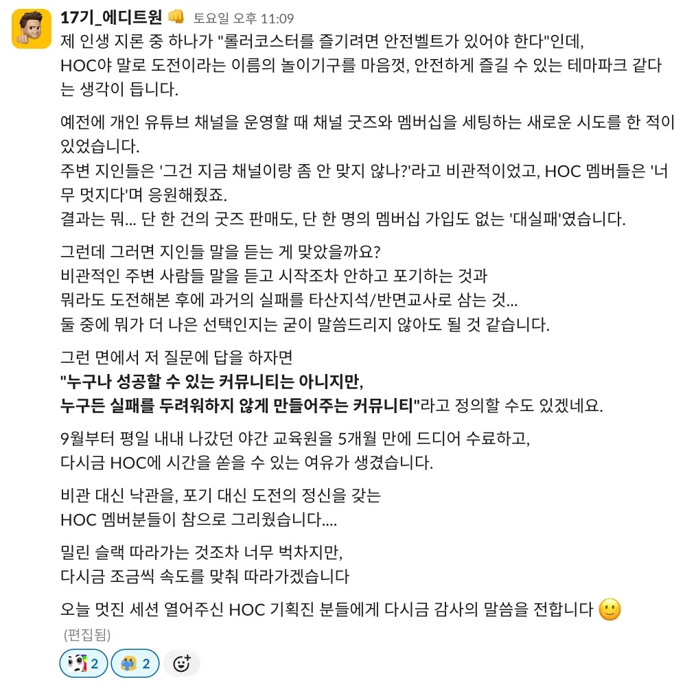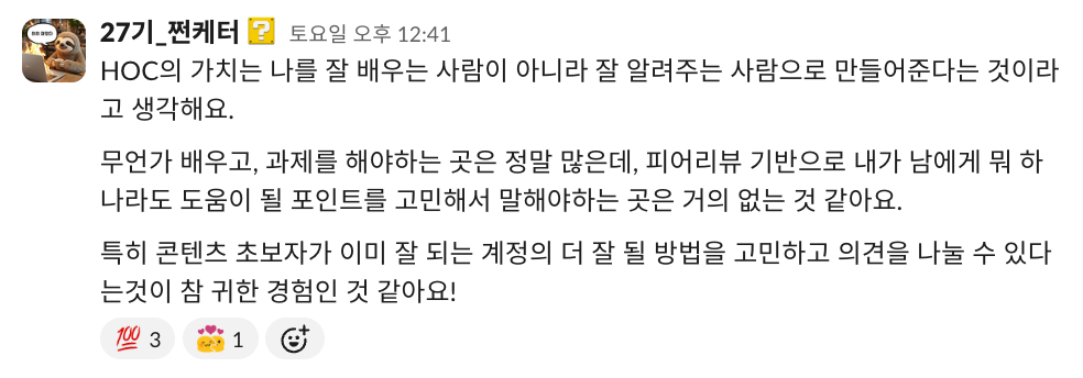 저도 이제야 처음 기수 활동을 하고, 왕성하게 하이아웃풋클럽에 푹 젖어 들었다고는 말하기 부끄럽지만 이렇게 따듯한 시선을 가진 사람들과 함께하는 커뮤니티가 있다는 든든함이 저를 더 나은 사람이 되고 싶게 만들거든요.